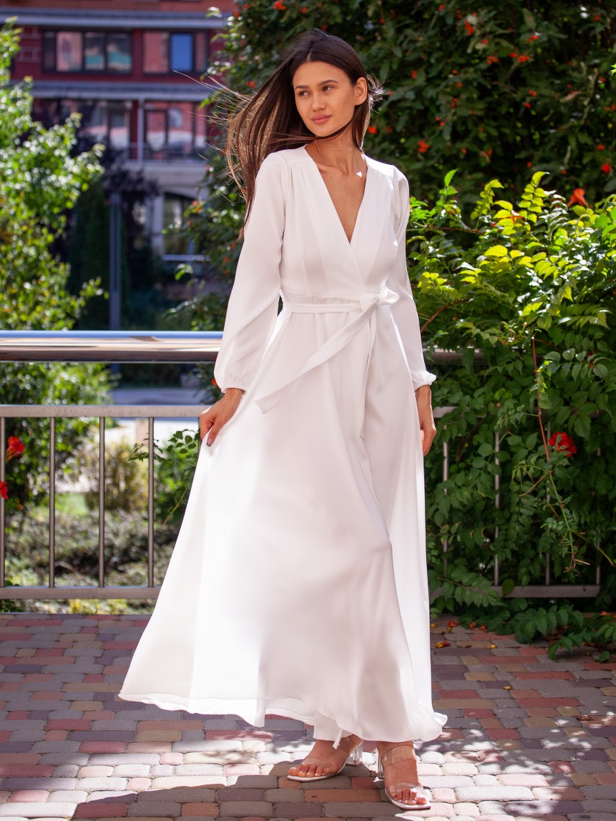Представьте, что вы сияете в этом очаровательном белом атласном макси-платье А-силуэта с рукавами. Это макси в пол – ваш выбор для любого особого случая, от свадебного платья до элегантного платья для помолвки.