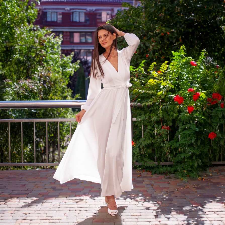 Белое шелковое платье в пол с длинными рукавами
