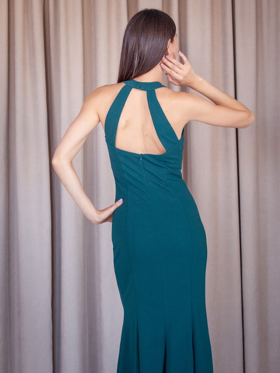 Длинное вечернее платье зеленого цвета с открытой спиной и разрезом