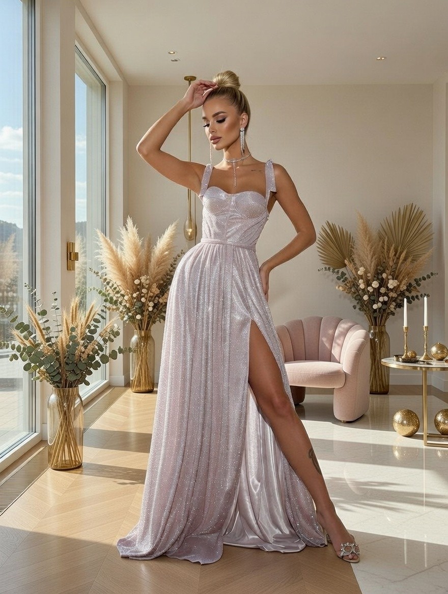 Длинное розовое платье с корсетом и с разрезом на ноге