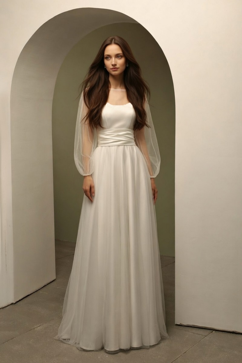 Свадебное длинное атласное платье с прозрачной накидкой