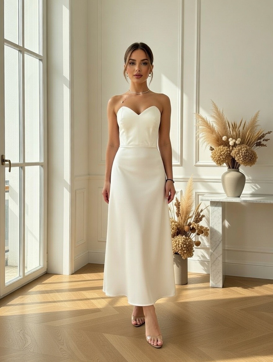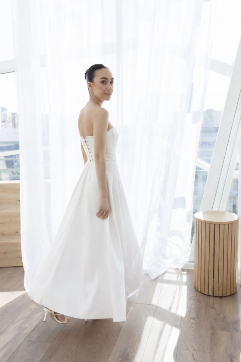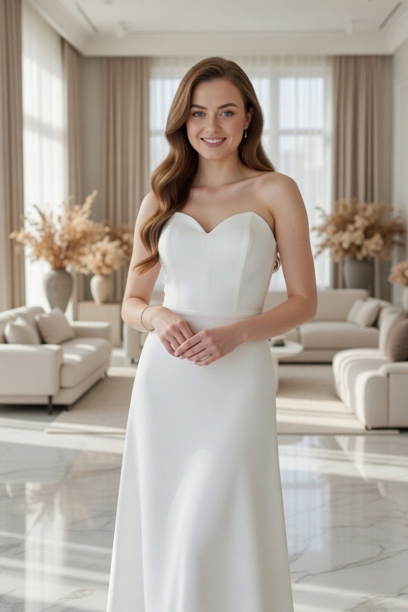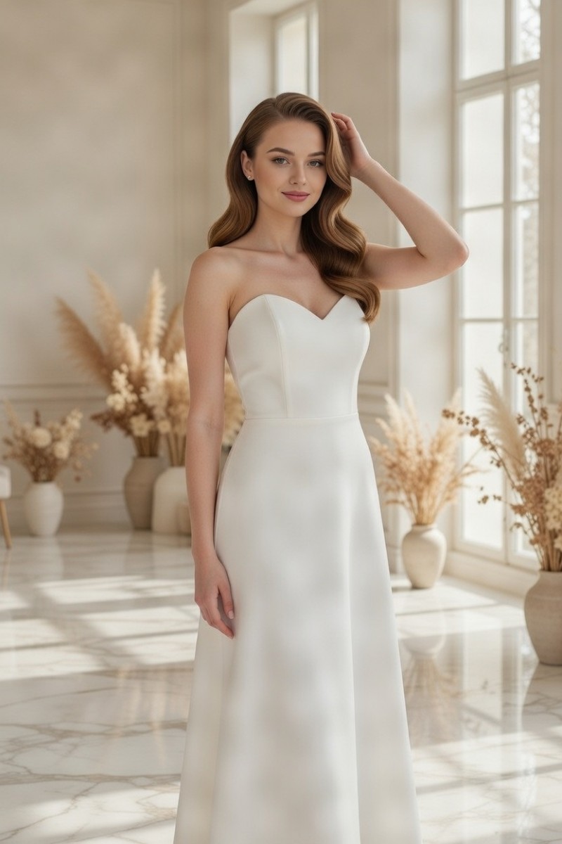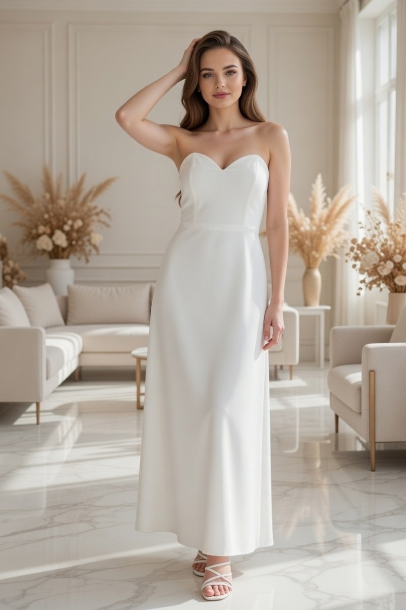 Длинное белое корсетное платье с оголенными плечами
