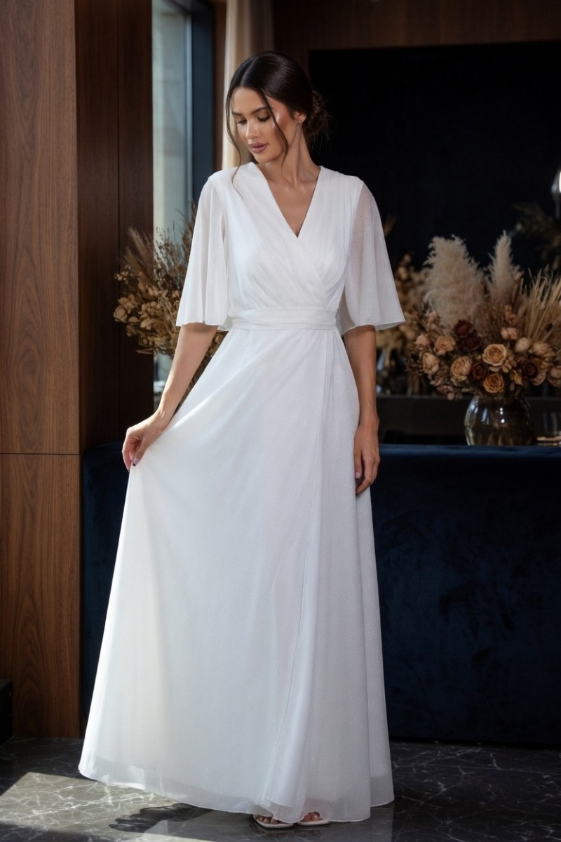 Ця елегантна біла максі-сукня втілює легку красу та вишуканість. М'який V-подібний виріз горловини підкреслює лінію декольте, а короткі напівпрозорі рукави-метелики додають легкості та витонченості. Пояс із тканини в тон м'яко підкреслює талію, створюючи збалансований, жіночний силует.