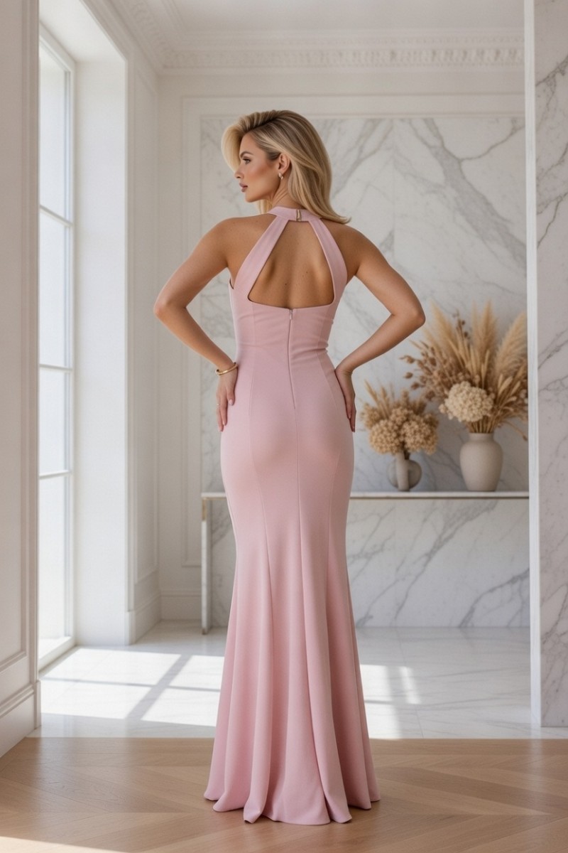 Это макси-платье длиной в пол красивого пастельно-розового цвета имеет облегающий приятный силуэт с подчеркнутой линией талии.