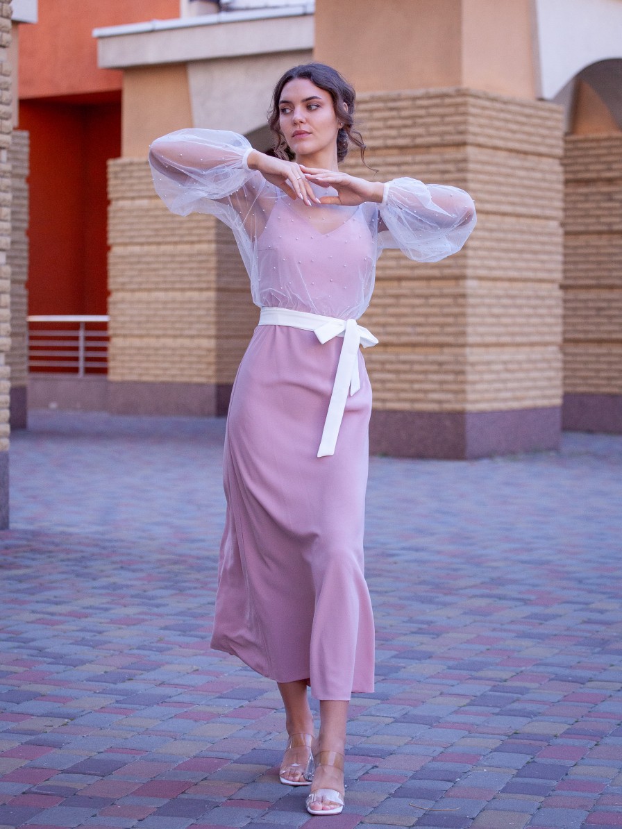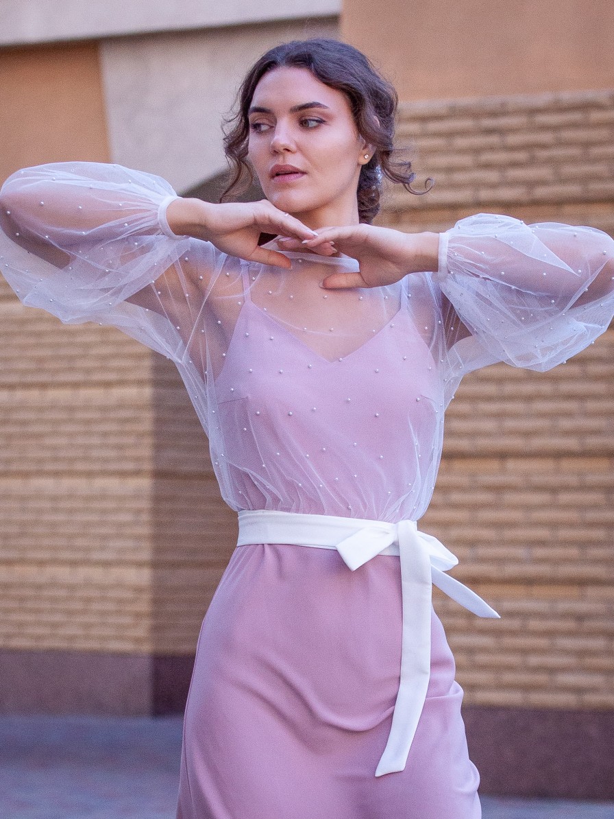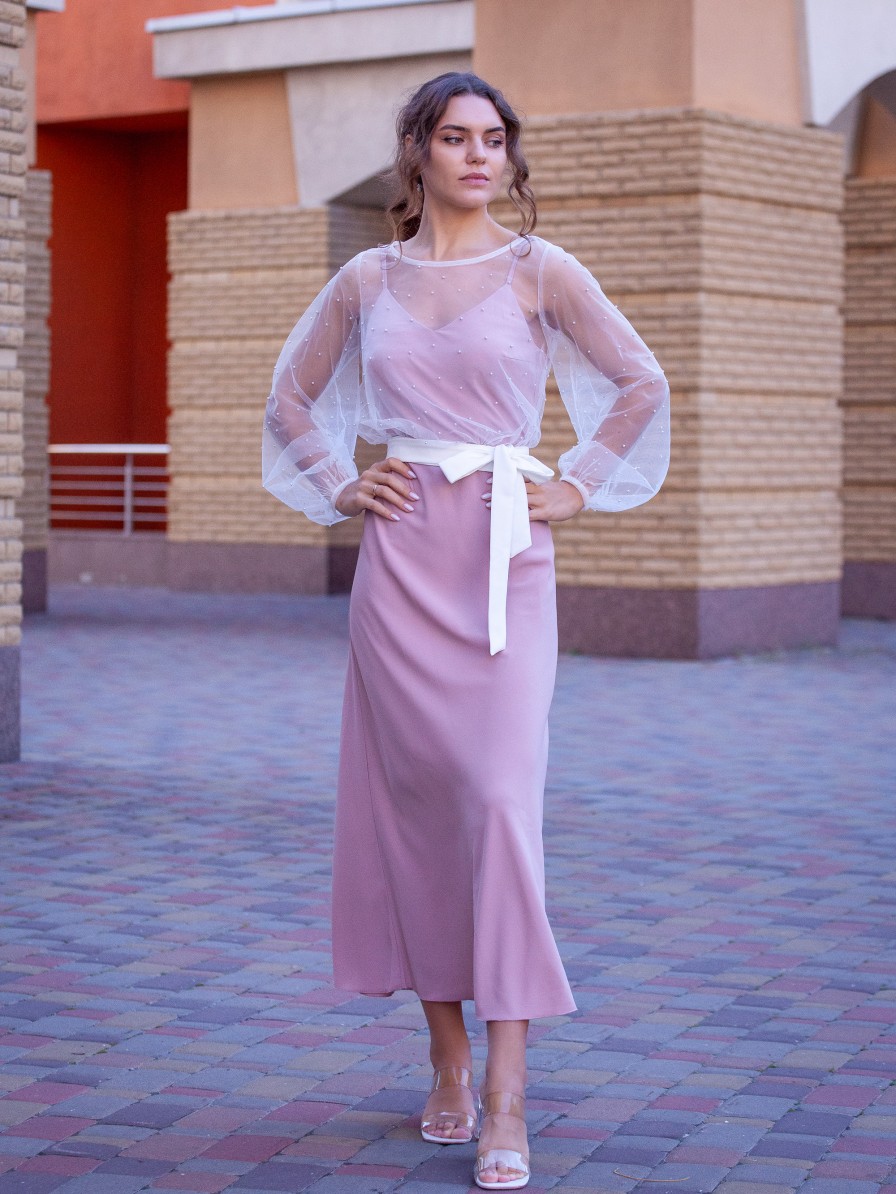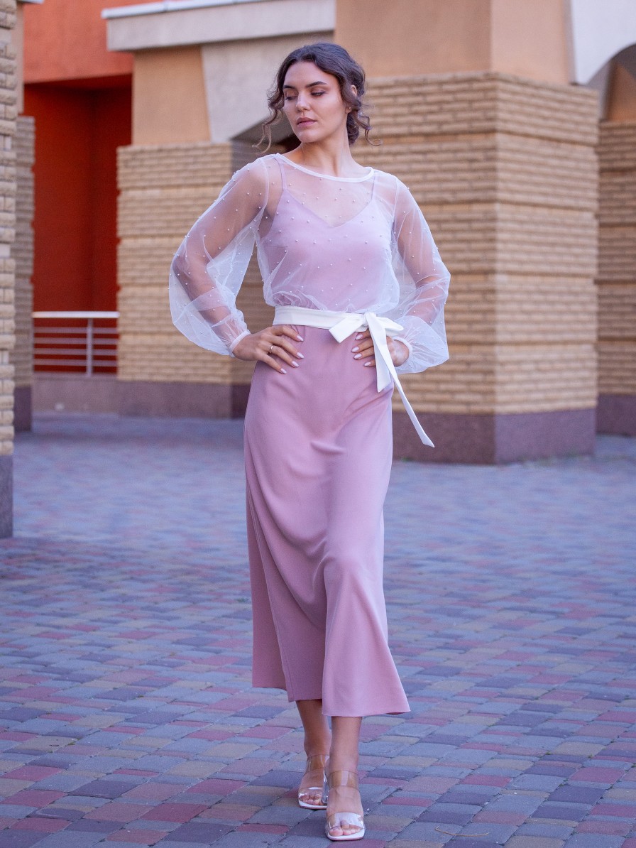 Длинное пудровое платье комбинация с белой нарядной накидкрой