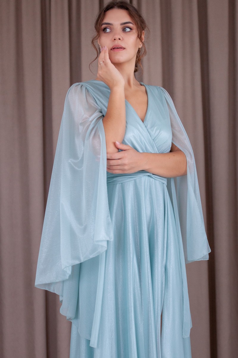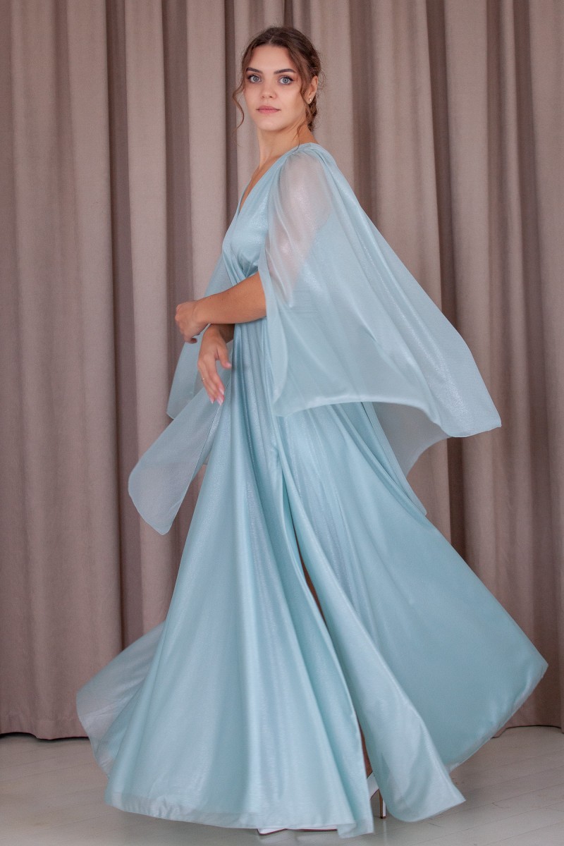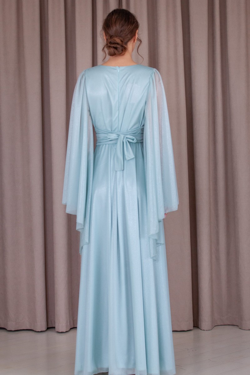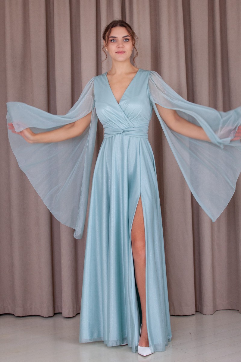 Сделайте шаг к элегантности с нашим потрясающим формальным платьем с V-образным вырезом и длинными рукавами, созданным специально для вашего следующего большого события! Шифоновая ткань шалфейно-зеленого цвета с естественным блеском и легкой растяжимостью каскадом ниспадает до длины в пол до А-линии силуэта, который элегантно облегает каждый изгиб. Это платье с рукавами «летучая мышь» и пришитым поясом на талии призвано подчеркнуть вашу красоту.