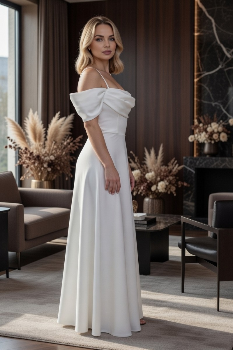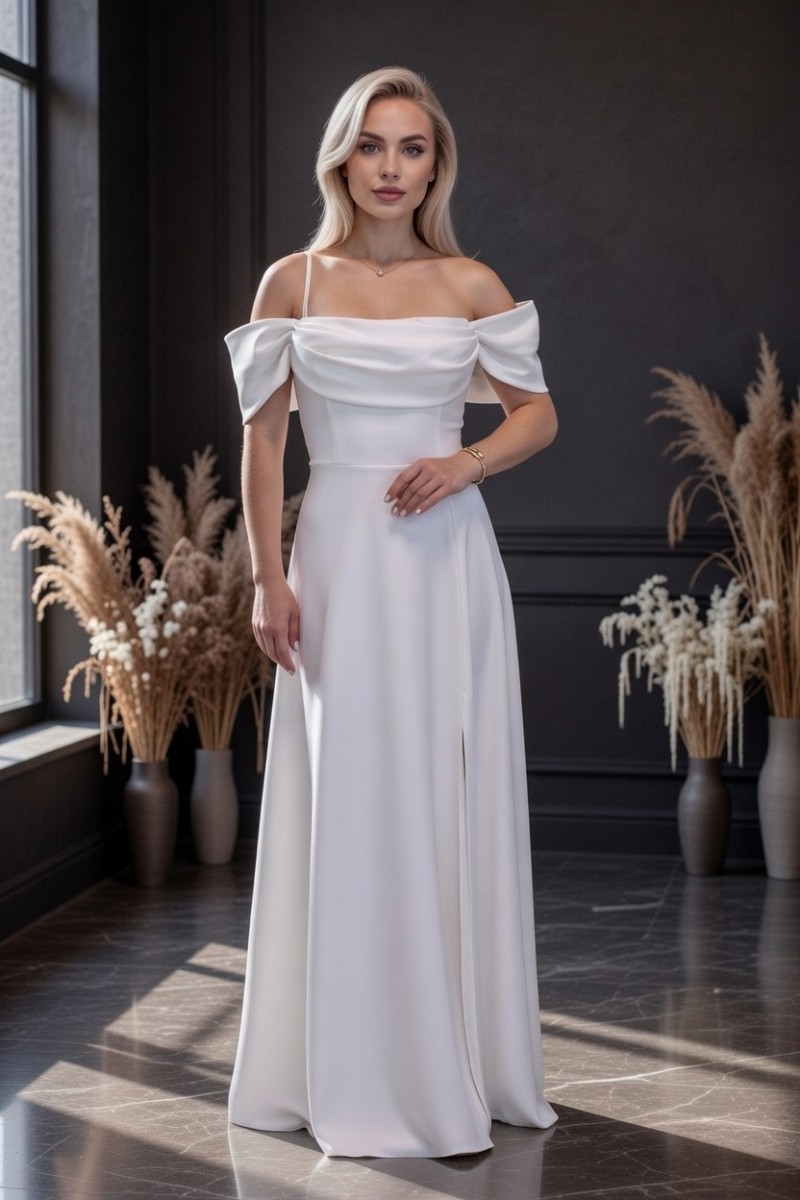 Это платье идеально подходит для гражданской свадьбы, помолвки или официального мероприятия, сочетая в себе минимализм и элегантность — выбор, который выглядит непринужденно романтично и бесконечно шикарно.