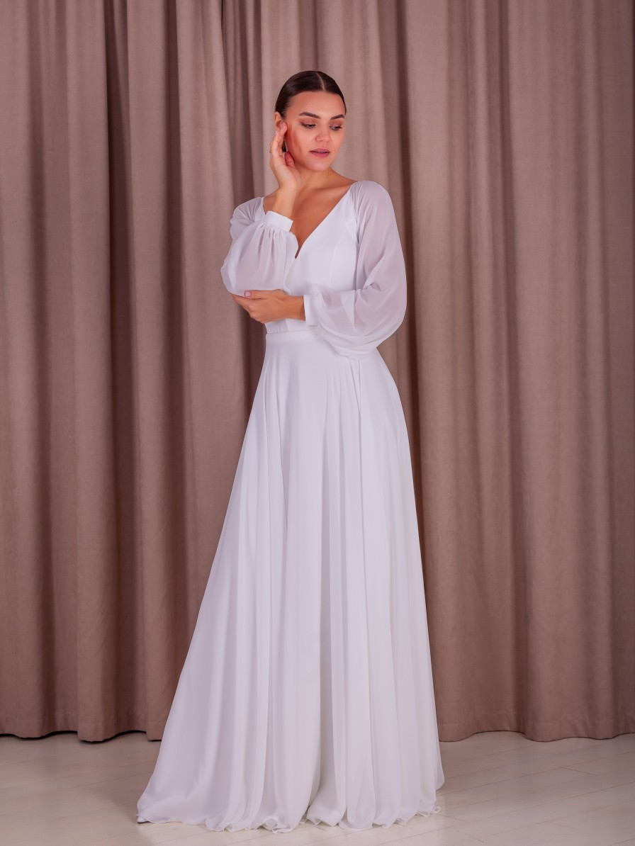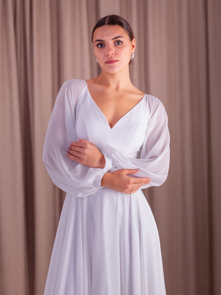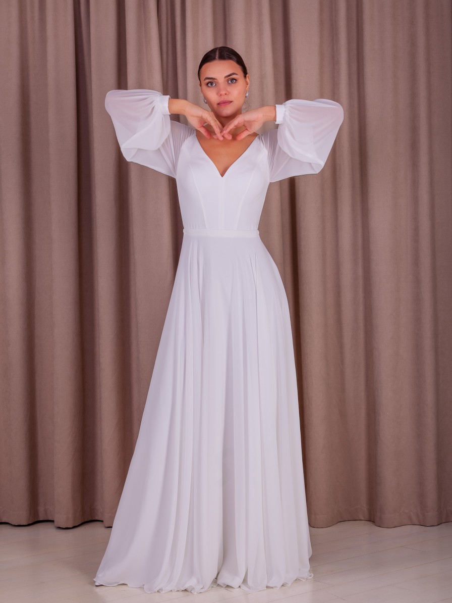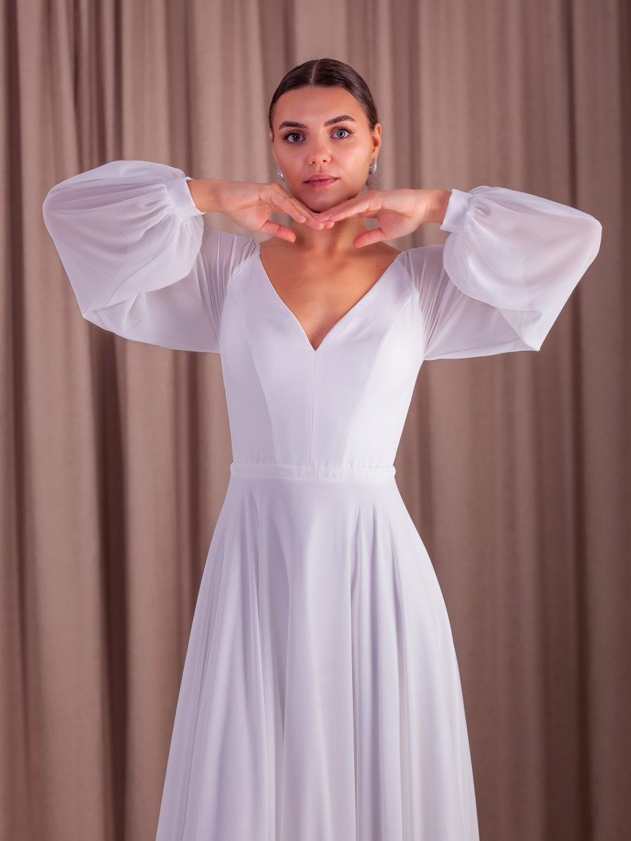 Свадебное белое шифоновое платье макси с V-образным вырезом белого цвета и длинными рукавами-буфами