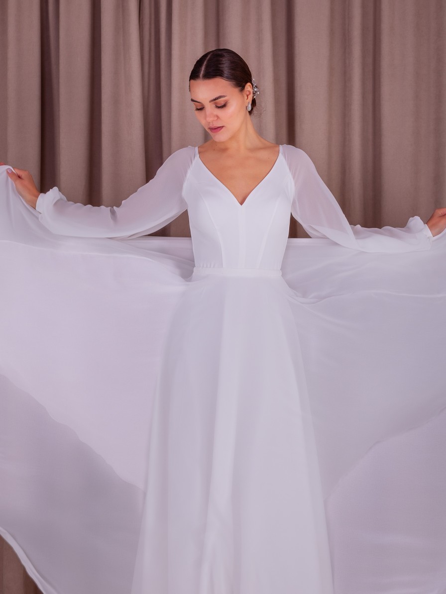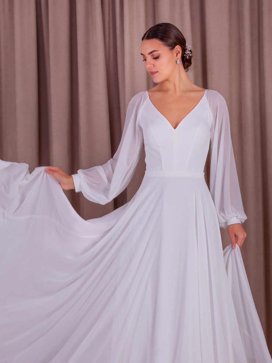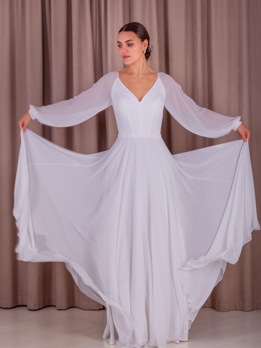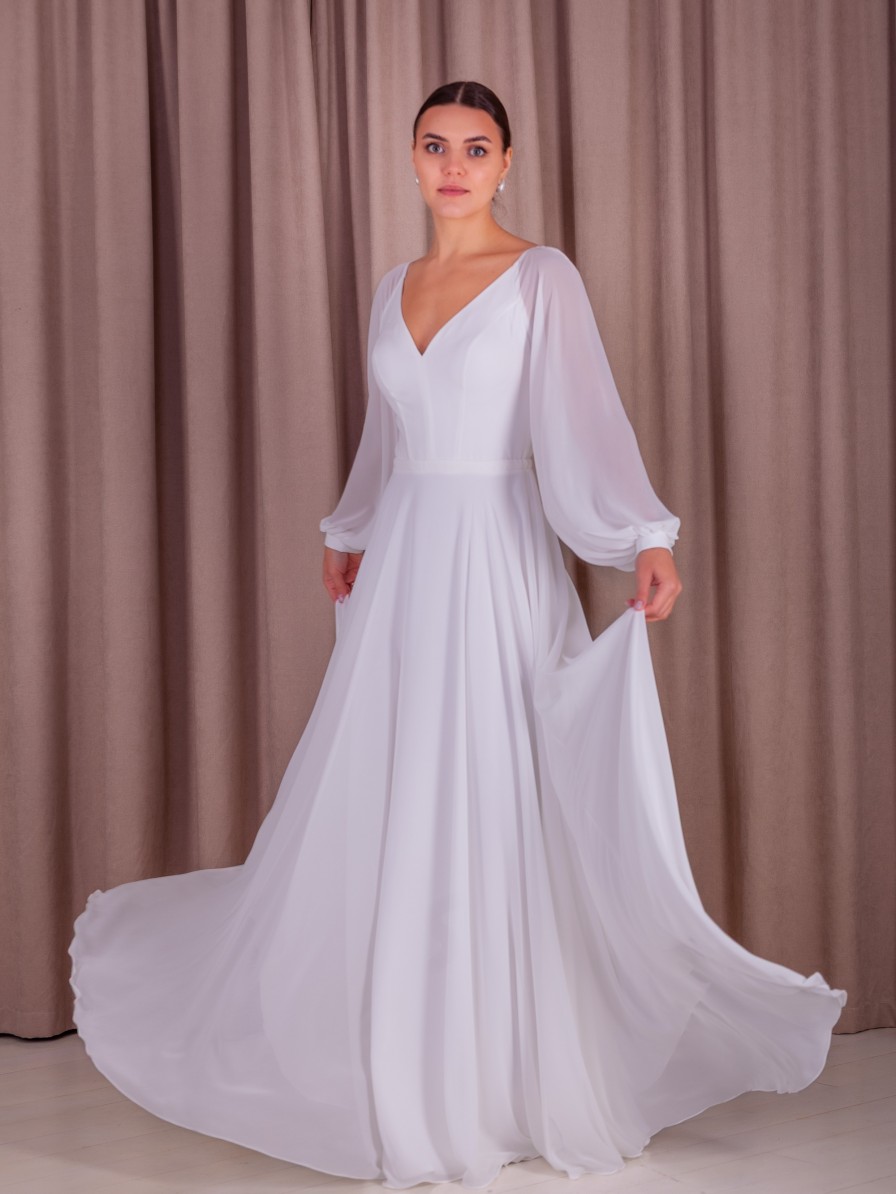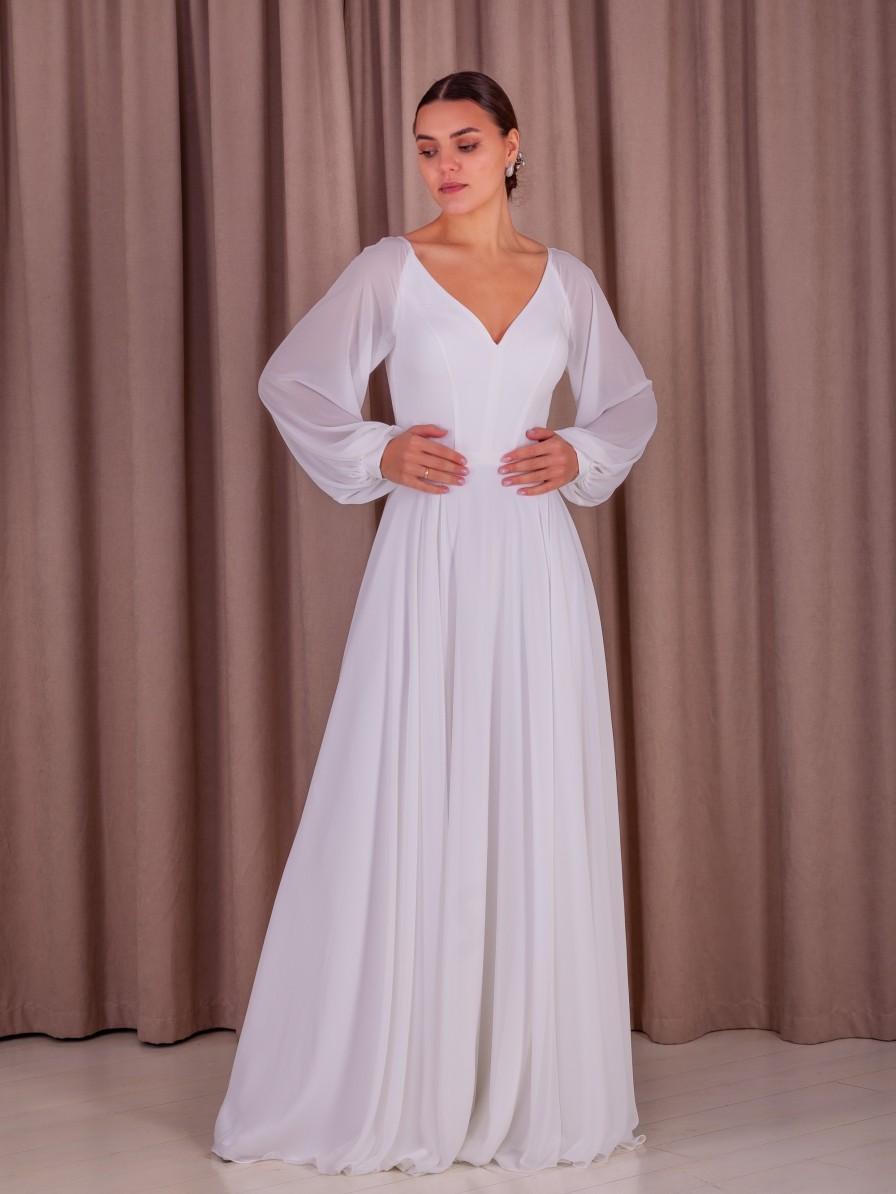 Свадебное белое шифоновое платье макси с V-образным вырезом белого цвета и длинными рукавами-буфами