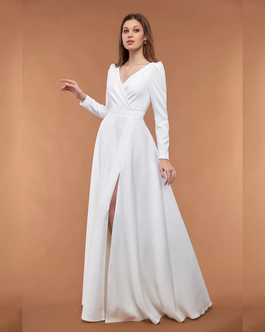 Классическое длинное белое платье на длинный рукав и с разрезом по ноге и с v вырезом