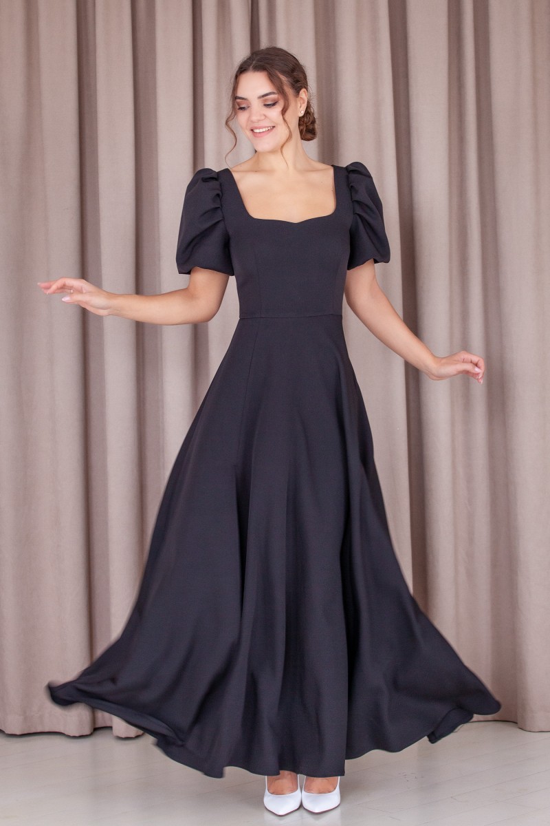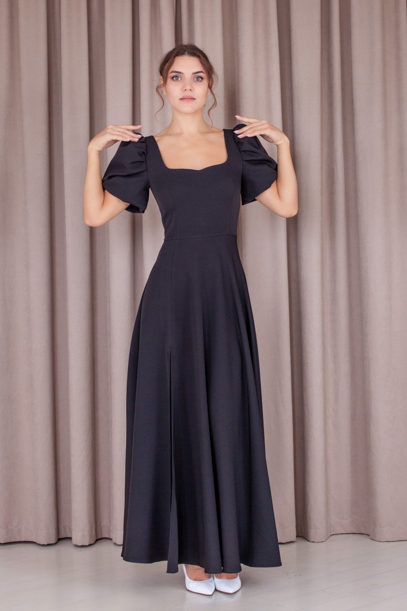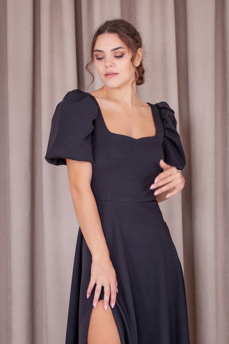 Вечернее длинное черное платье с рукавами фонариками и разрезом