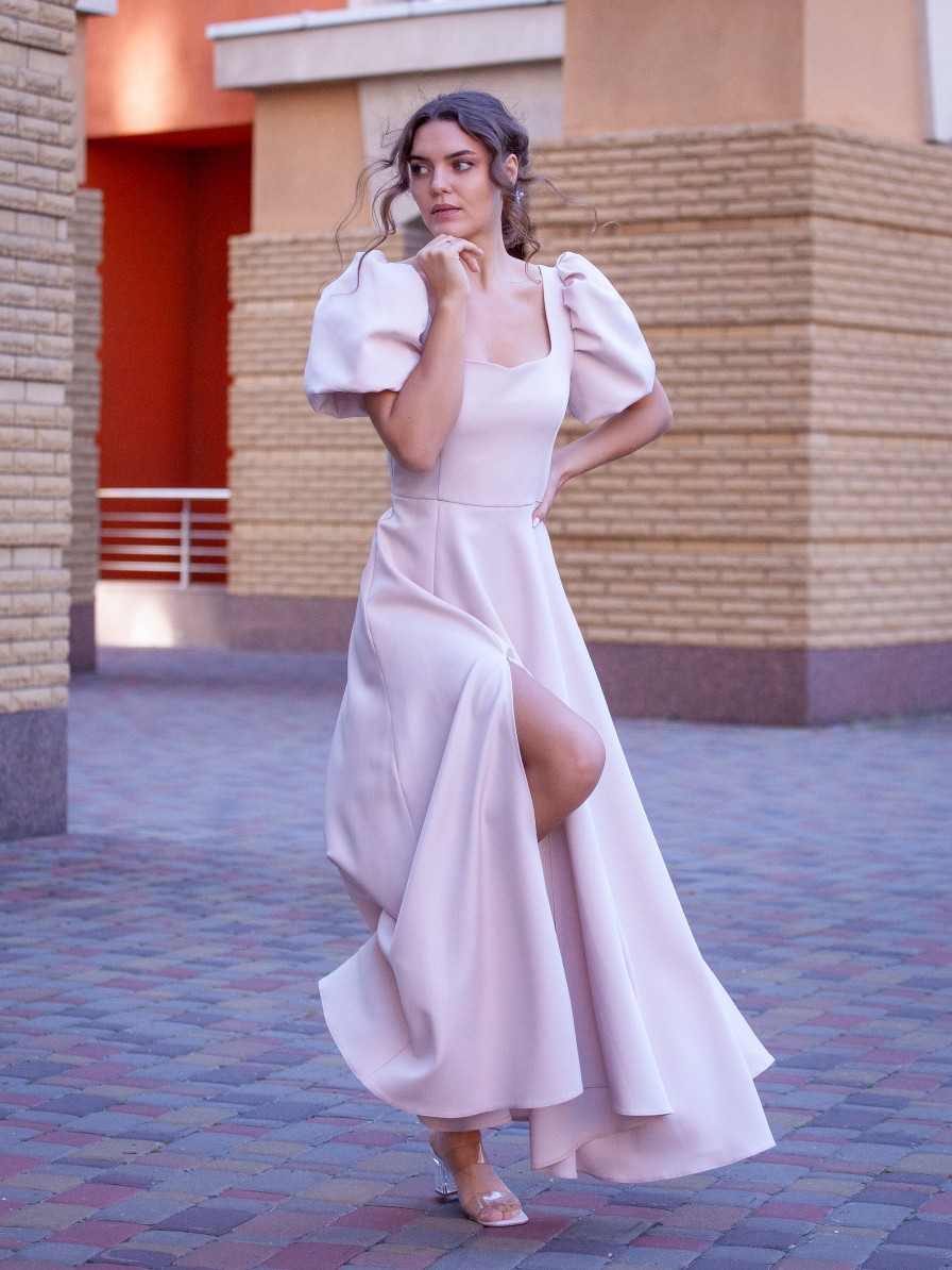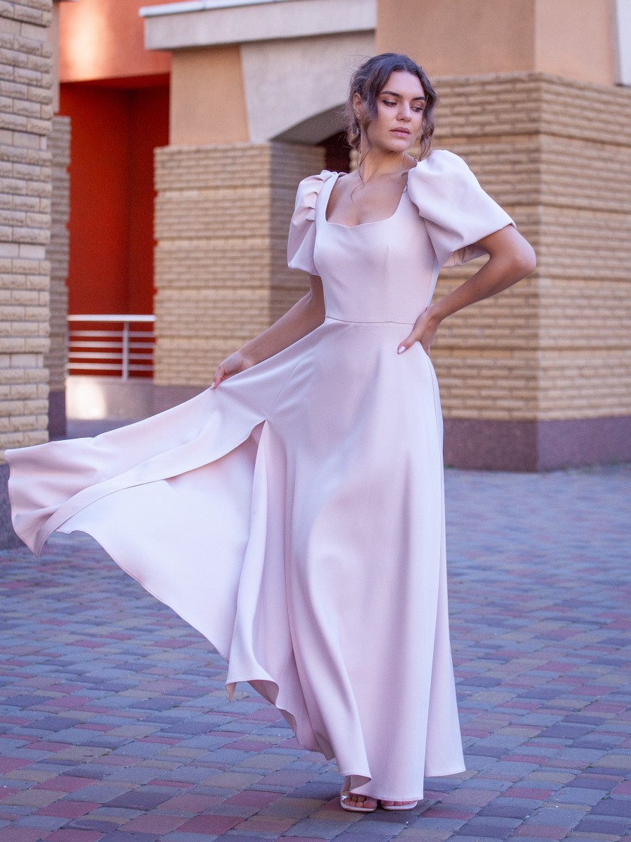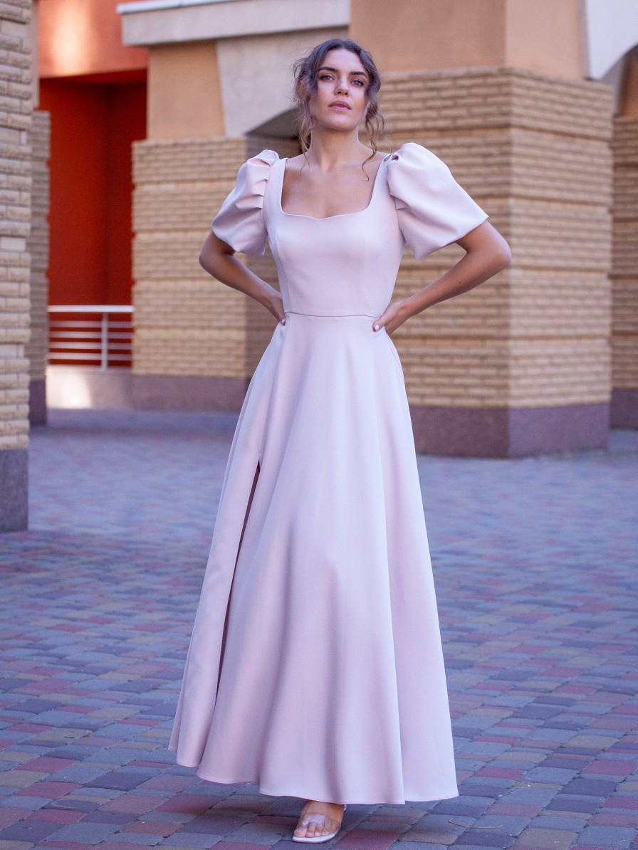 Вечернее длинное бежевое платье с рукавами фонариками и разрезом