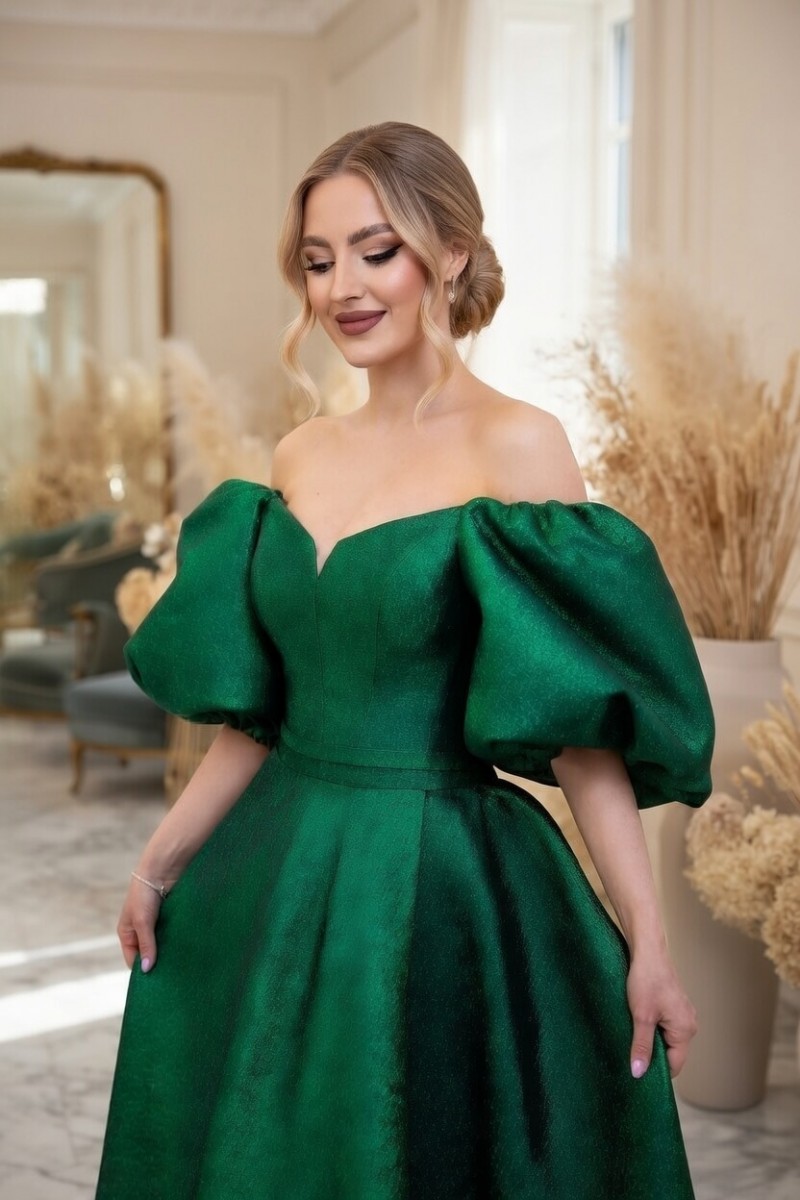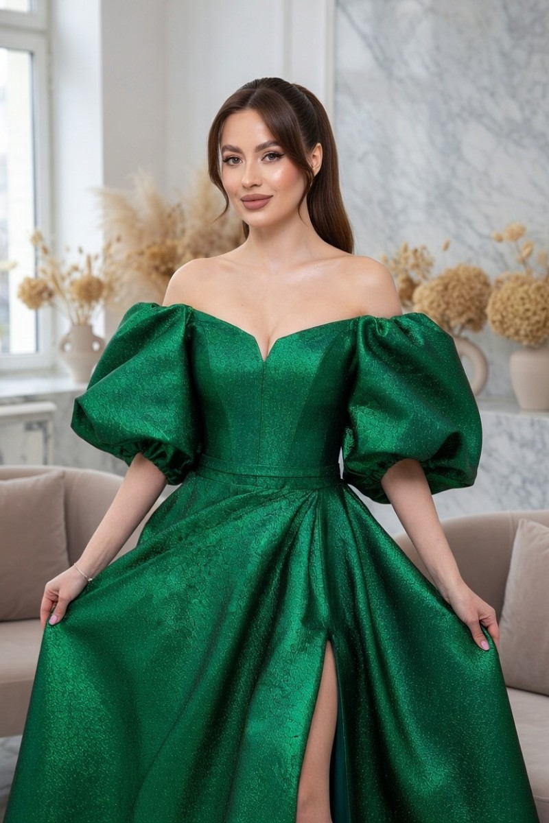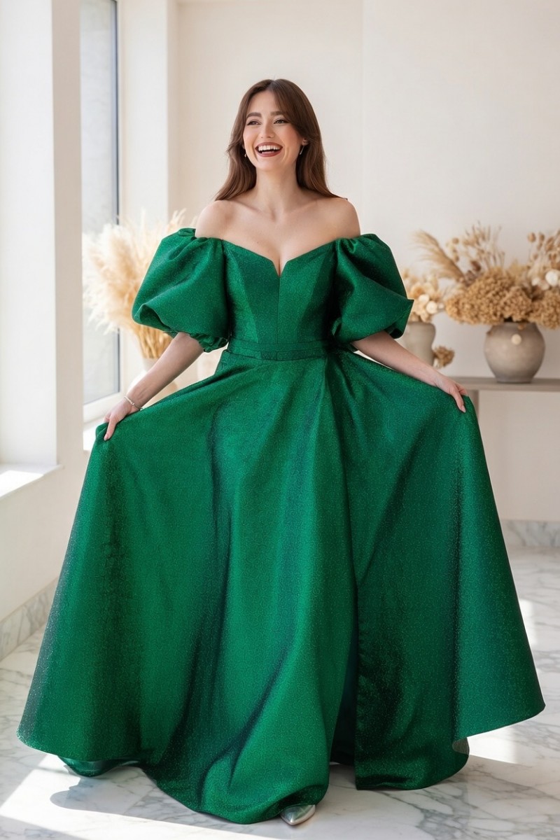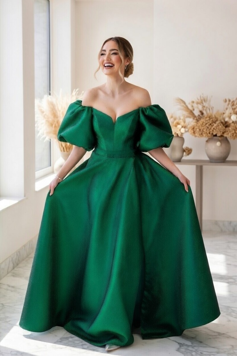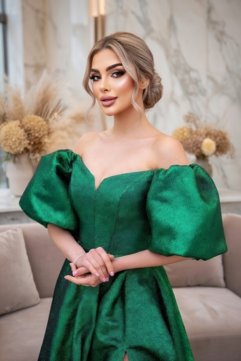 Поверните головы и зажгите комнату нашим эффектным вечерним платьем очаровательного изумрудно-зеленого цвета. Окунитесь в мир элегантности и очарования, погрузившись в этот захватывающий дух шедевр. В тот момент, когда вы украсите себя его струящимся макси-силуэтом до пола, вы почувствуете прилив уверенности и грации, как никогда раньше. А-силуэт и расклешенный силуэт легко подчеркивают вашу естественную талию, делая вашу фигуру максимально привлекательной. Короткие рукава-фонарики добавляют модной изысканности, делая вас воплощением современной женственности.