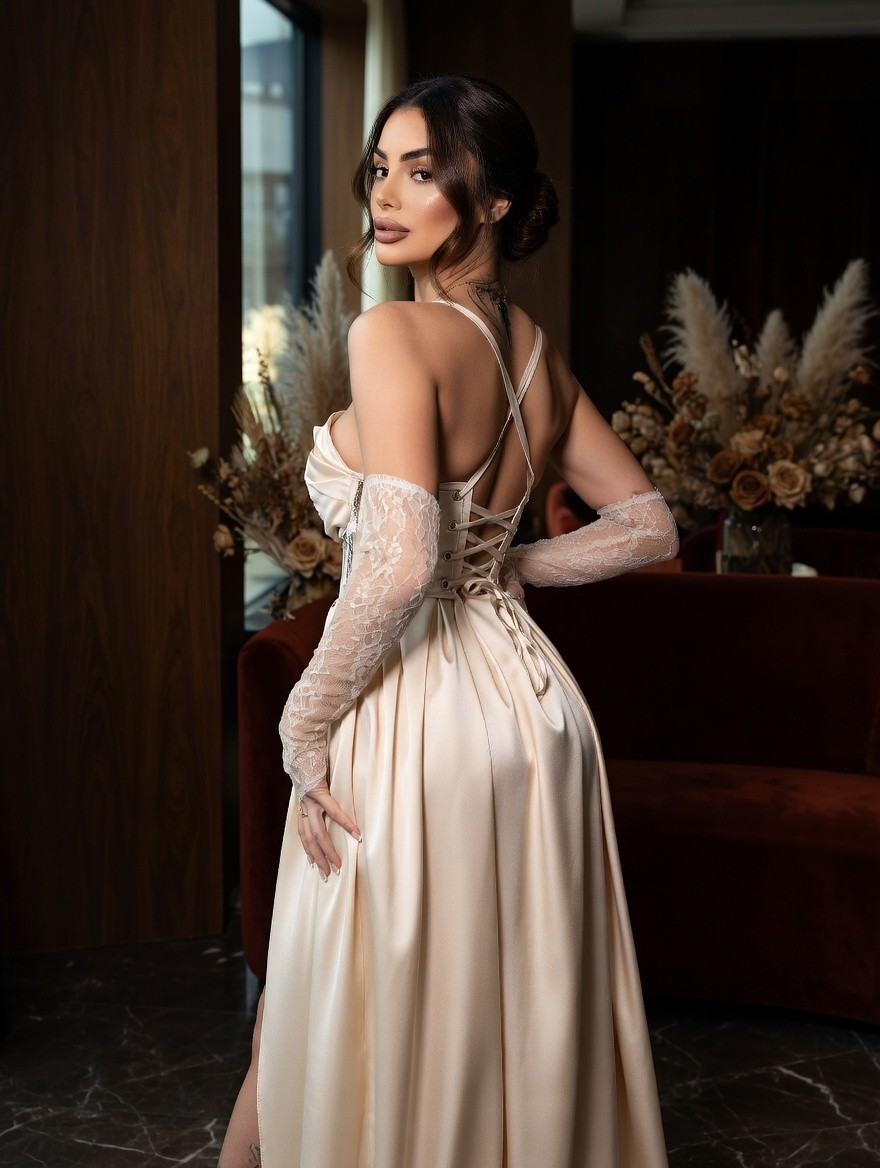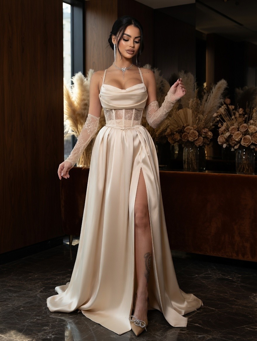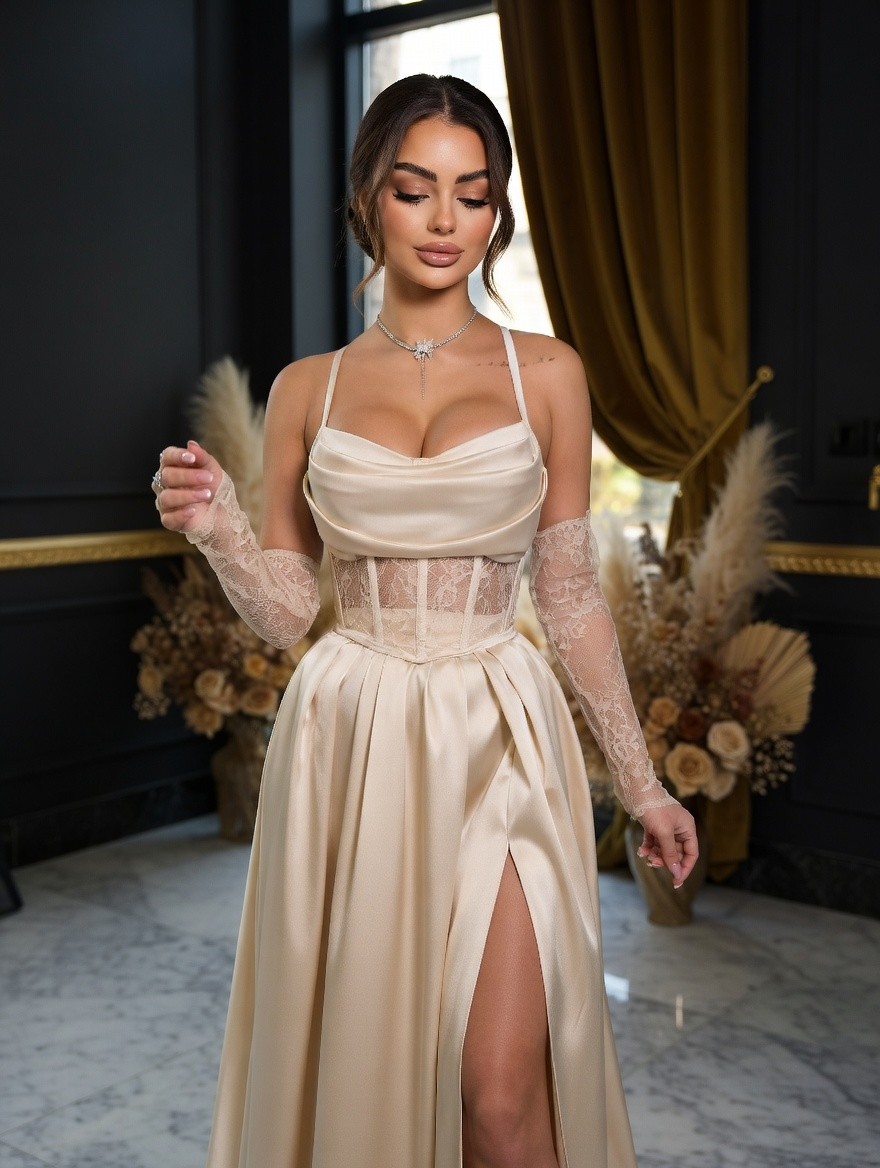 Светлое платье в пол: кружевной корсет и атласная юбка с разрезом