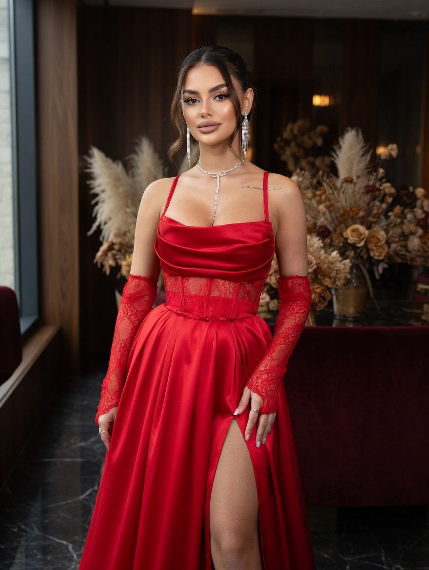 Красное платье в пол: кружевной корсет и атласная юбка с разрезом