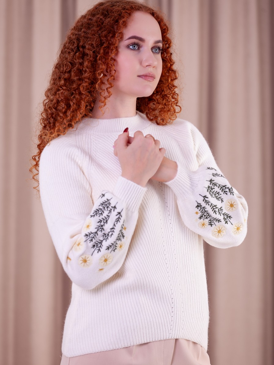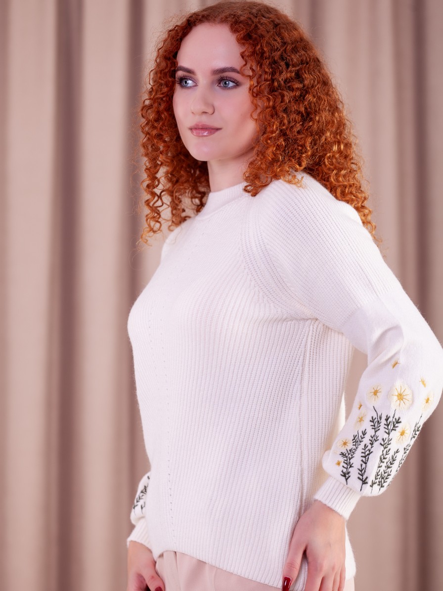 Женский вязаный свитер с цветочным узором на рукавах