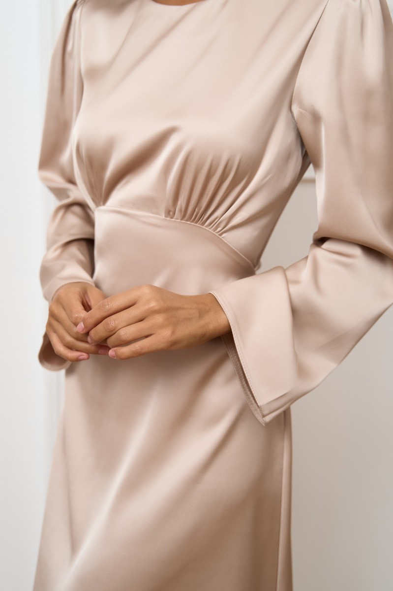 Ощутите элегантность в этом бежевом атласном коктейльном платье миди, которое идеально подойдёт для любого случая! Классический круглый вырез горловины и роскошные рукава-трубы, А-силуэт с завышенной талией подчеркнёт вашу фигуру. Будь то летняя свадьба или осенняя вечеринка, вы будете в центре внимания в этом универсальном платье.