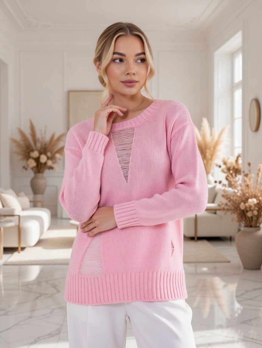 Розовый женский теплый свитер с оригинальными потертостями розового цвета