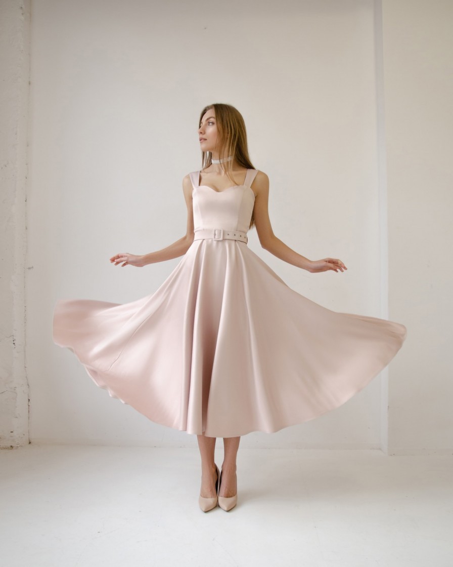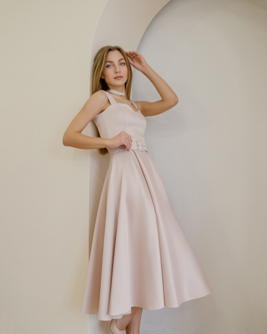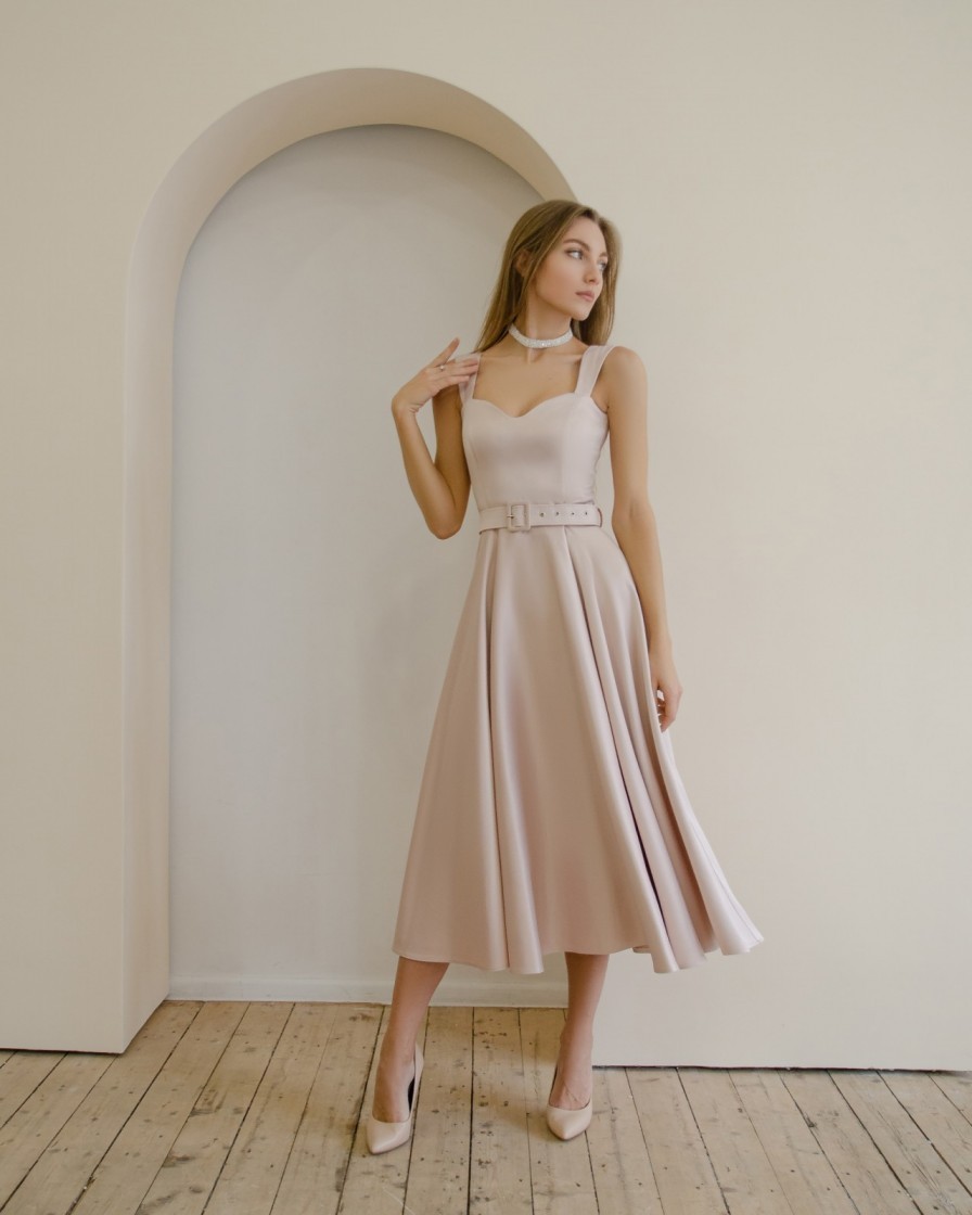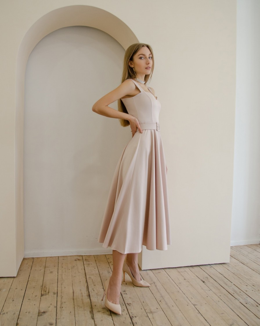 Нарядное платье миди длины бежевого цвета