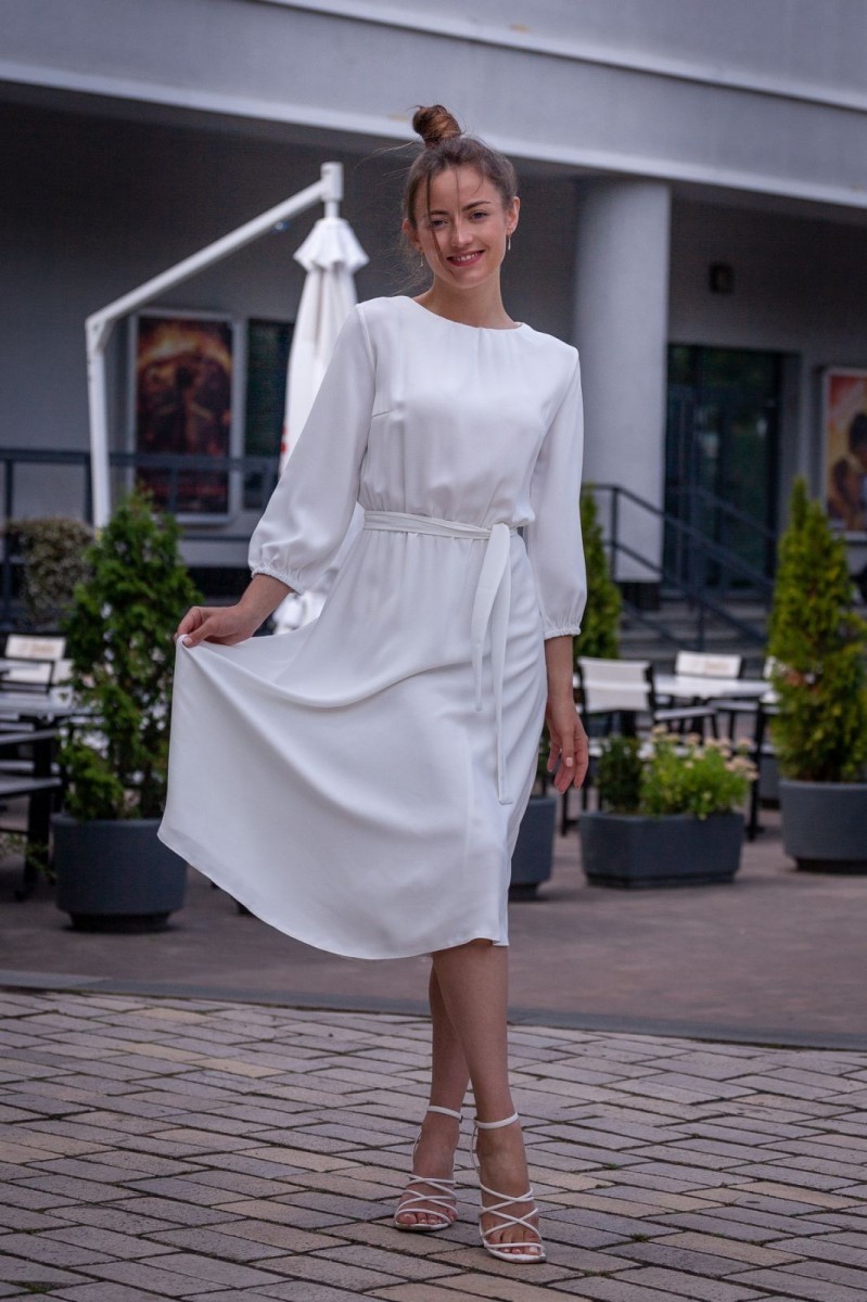 Классическое белое платье-миди трапеции с рукавами-фонариками и съемным поясом для помолвочных фотографий