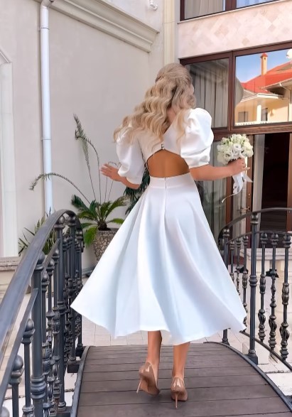 Элегантное белое платье-миди с объемными рукавами-фонариками: идеальный наряд для коктейля или свадьбы