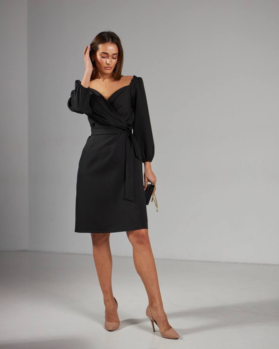 Черное платье меди на запах с разрезом и рукавами-фонариками на лето, весну и осень