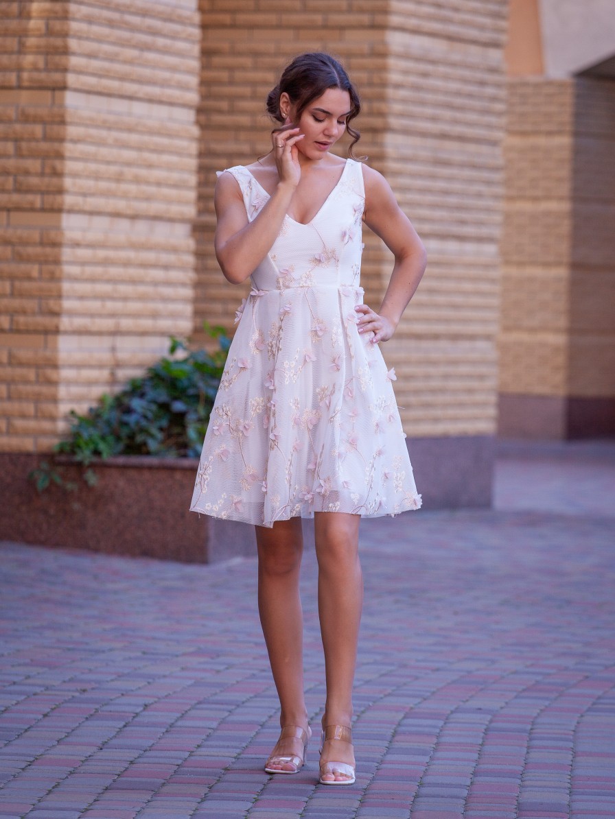 Короткое нарядное бежевое платье до колен