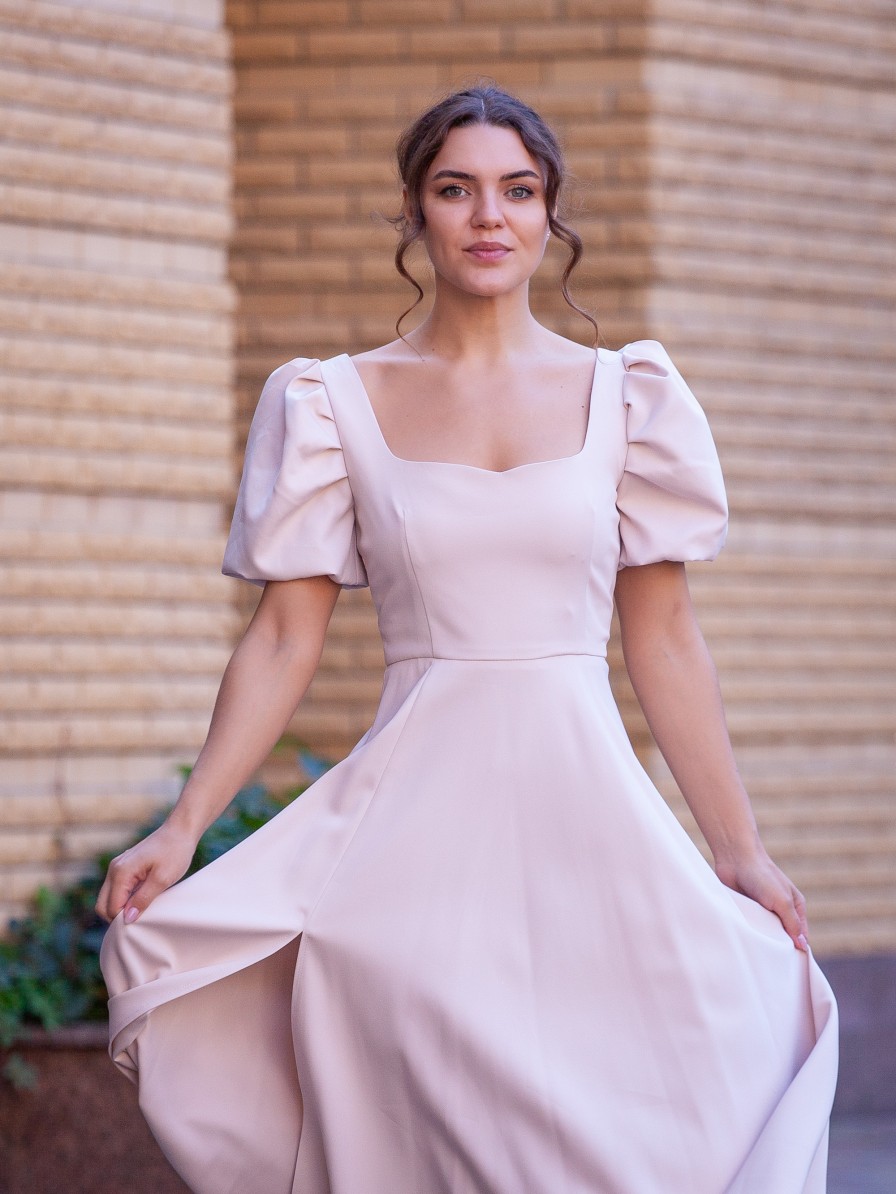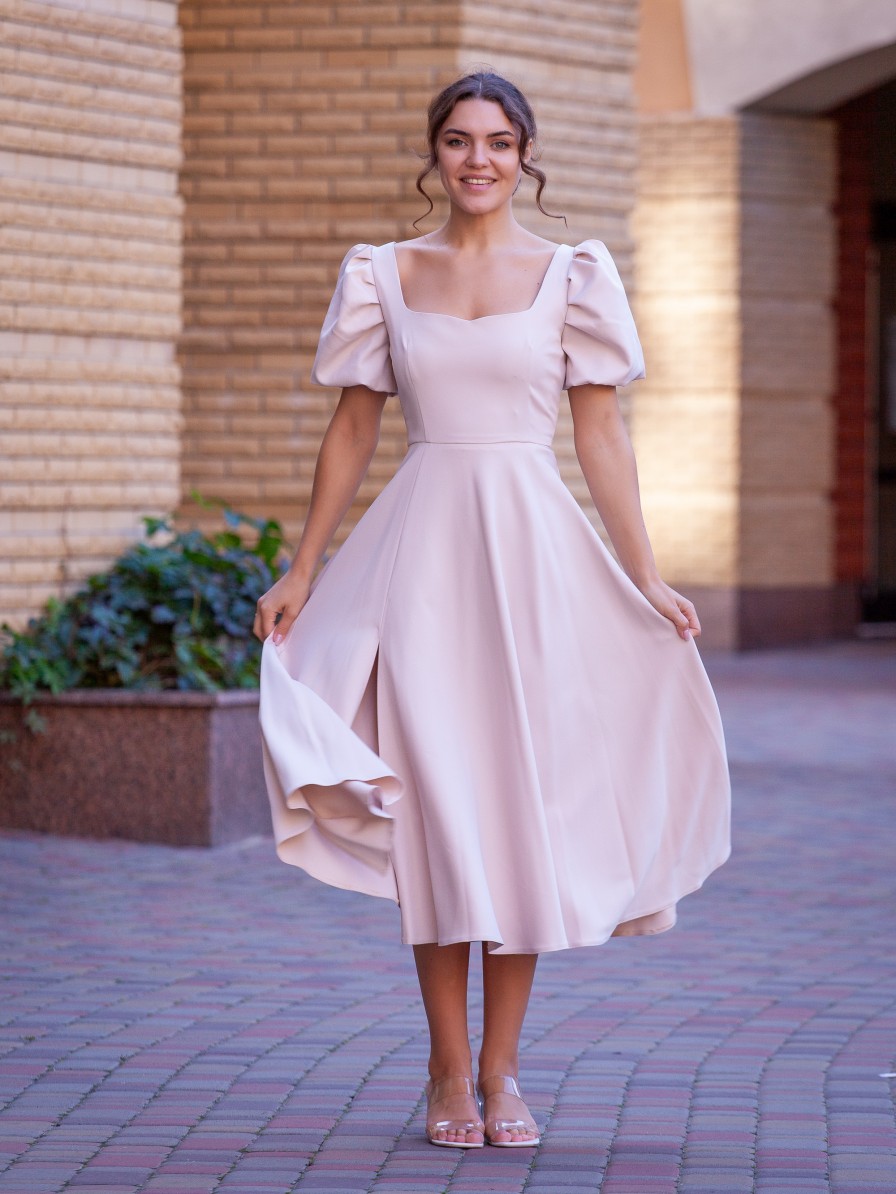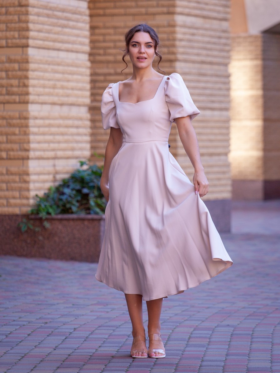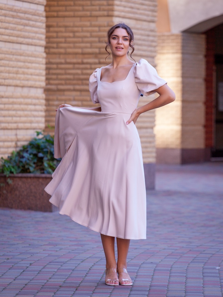 Нарядное бежевое платье миди длины с рукавами фонариками