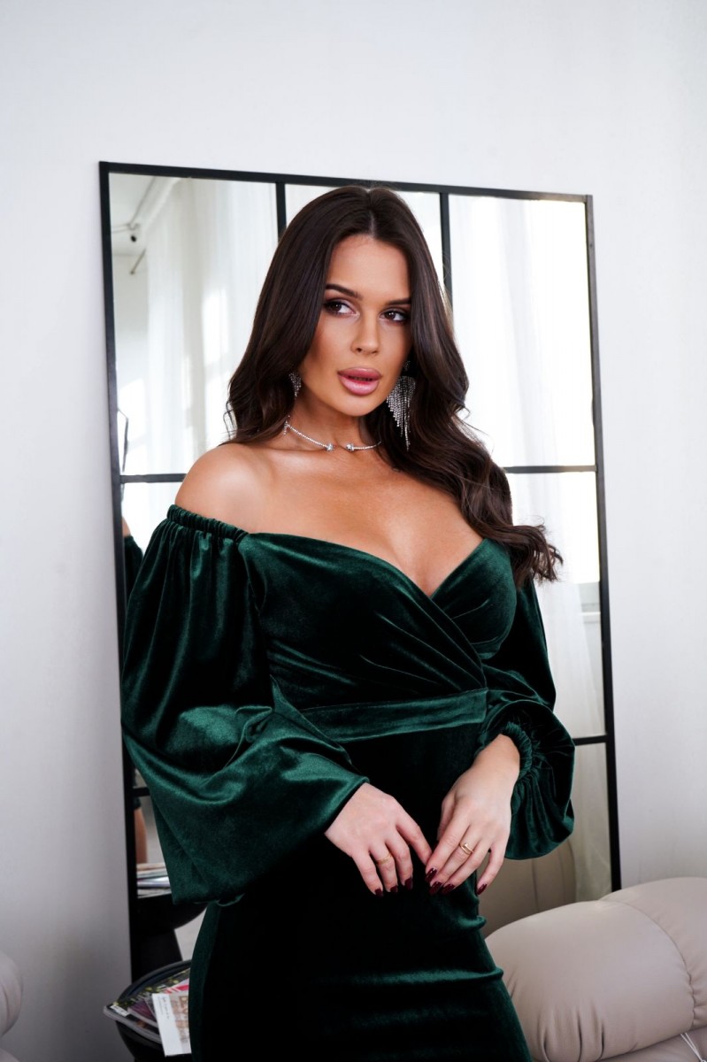 Бархатное изумрудное футлярное платье с открытыми плечами