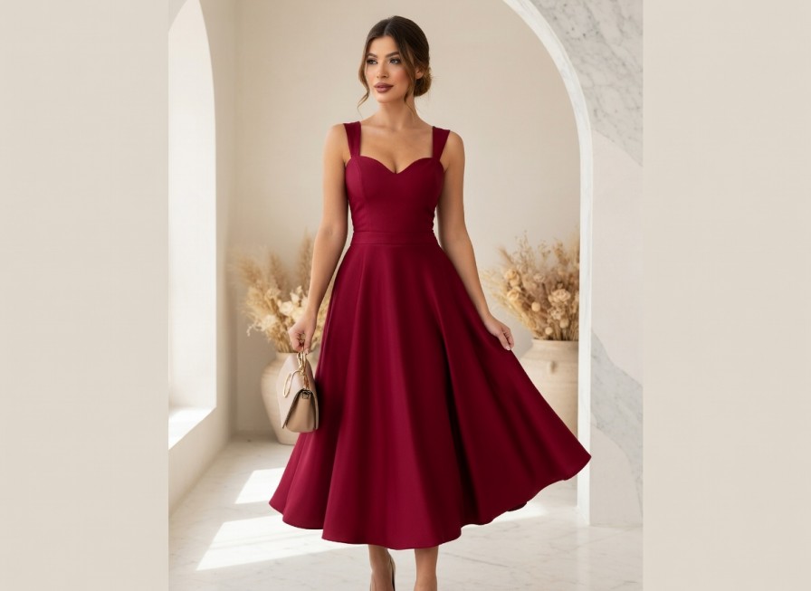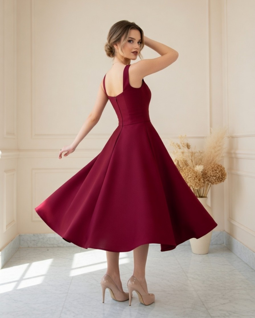 Бордовое нарядное платье миди с широкими бретелями
