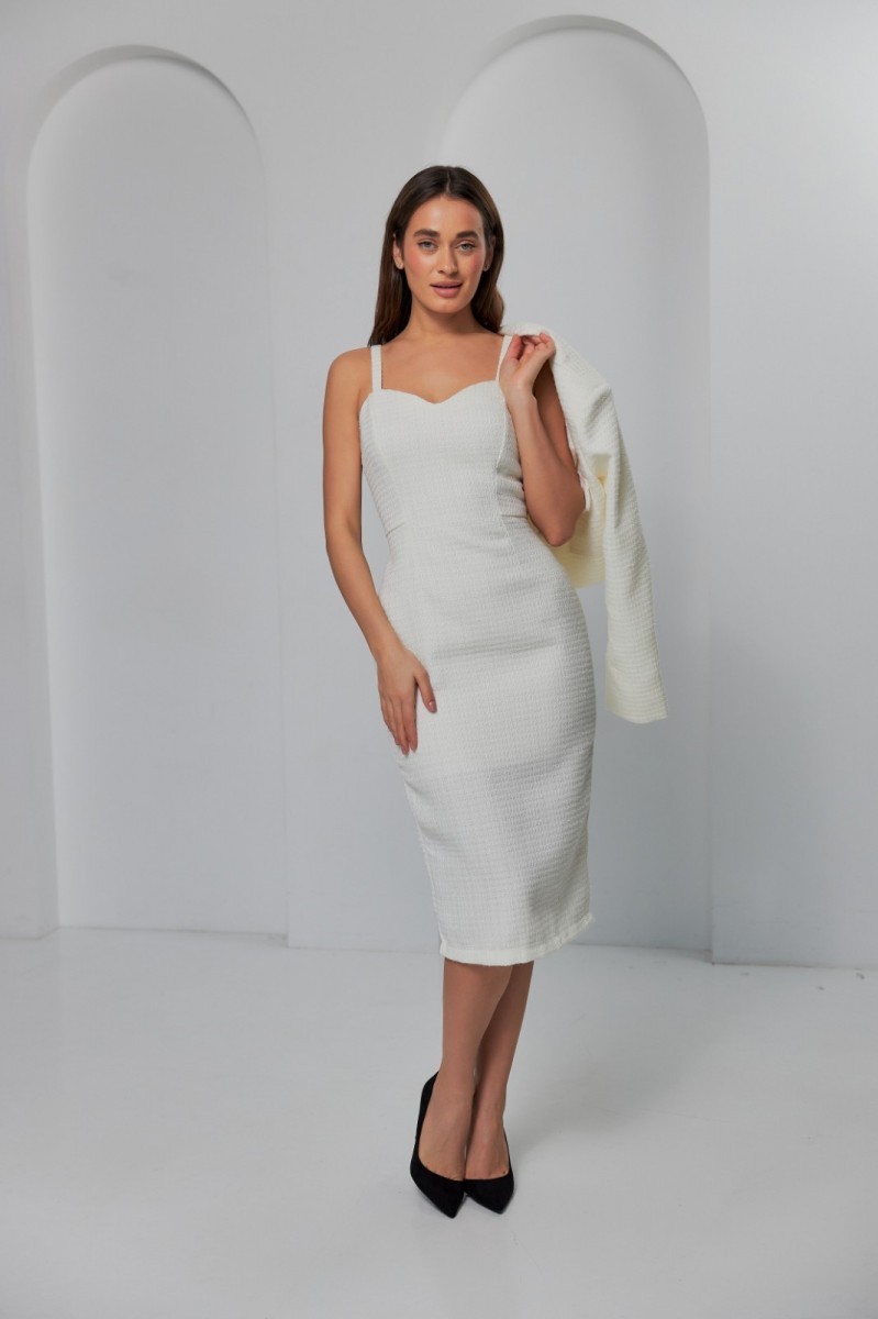 Стильное молочное твидовое платье миди длины