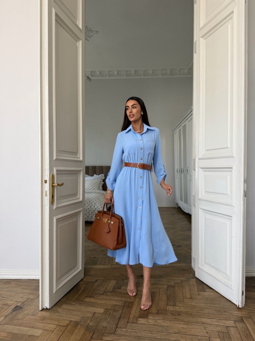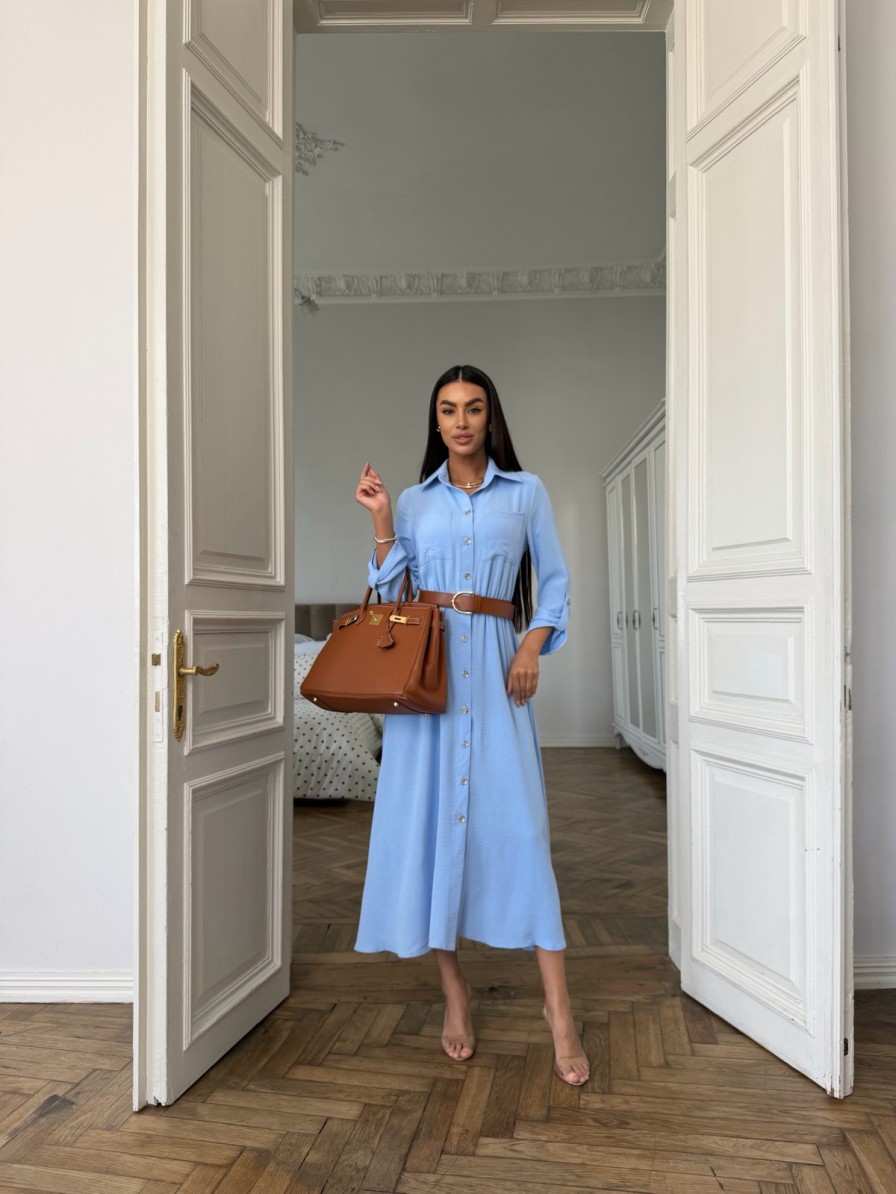 Голубое льняное платье на пуговицах с поясом
