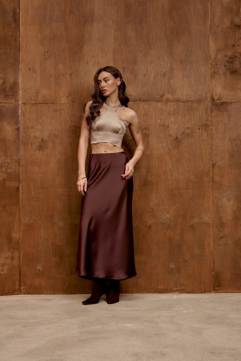 Летняя юбка миди длины шоколадного цвета