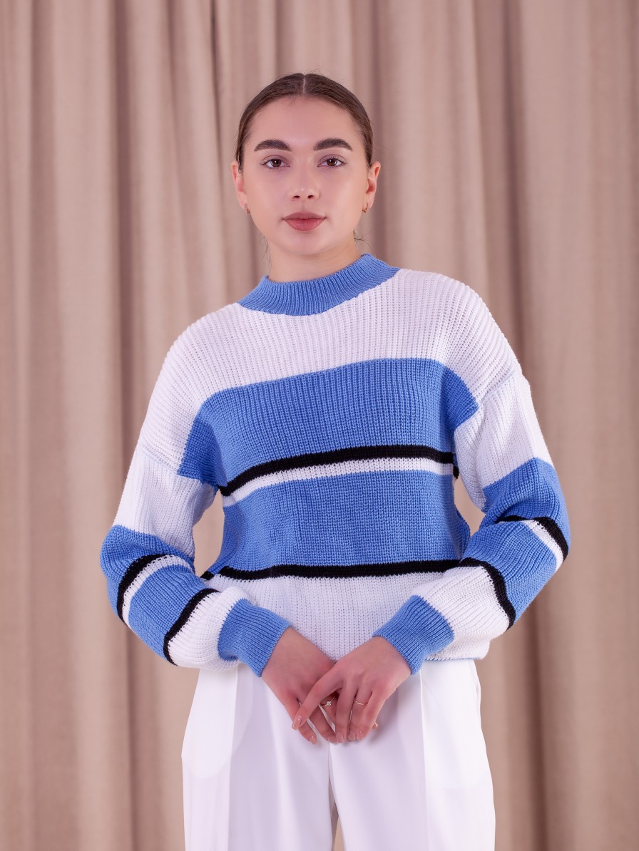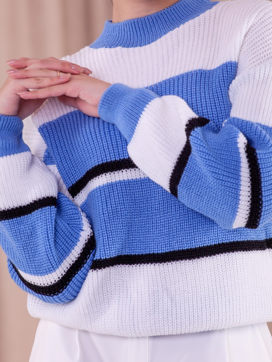 Модный вязаный свитер с сине-белой полоске с черными акцентами. Мягкий трикотаж, комфортный свободный крой и универсальный дизайн делают его идеальным выбором для повседневного образа к джинсам в холодное время года.