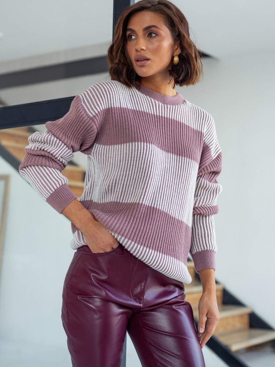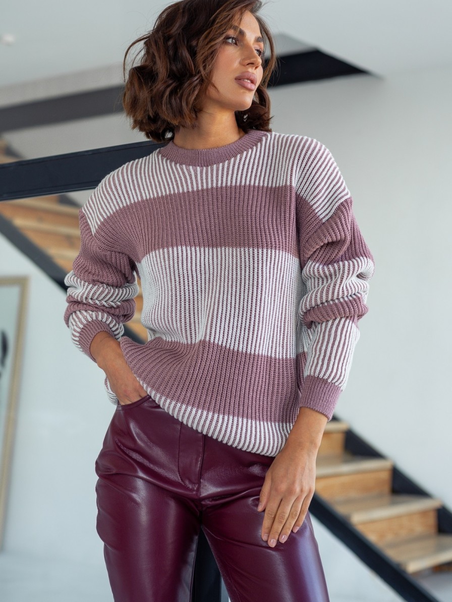 Вязаный свитер пудрового цвета в полоску