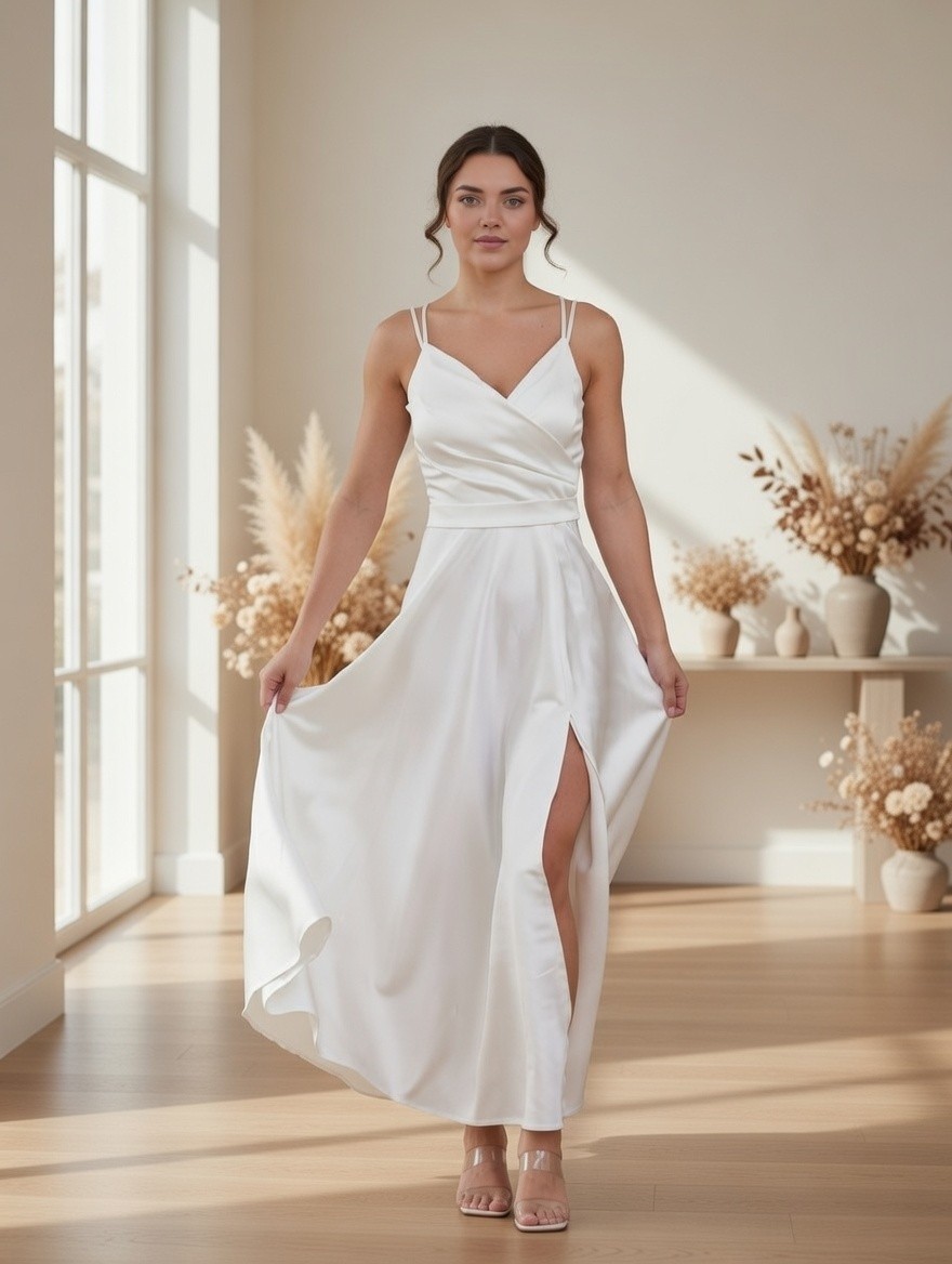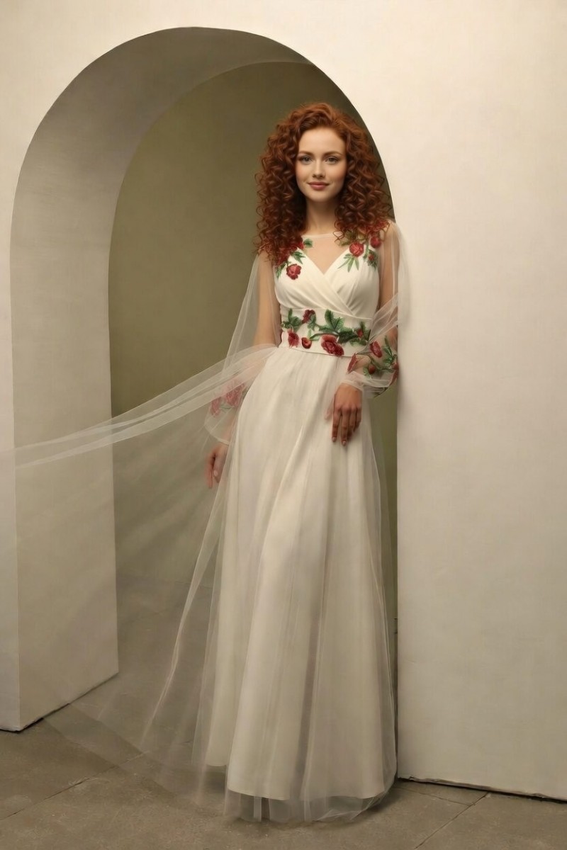 Атласное белое платье с вышитой накидкой