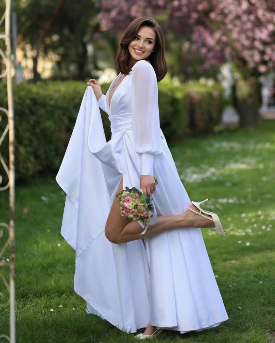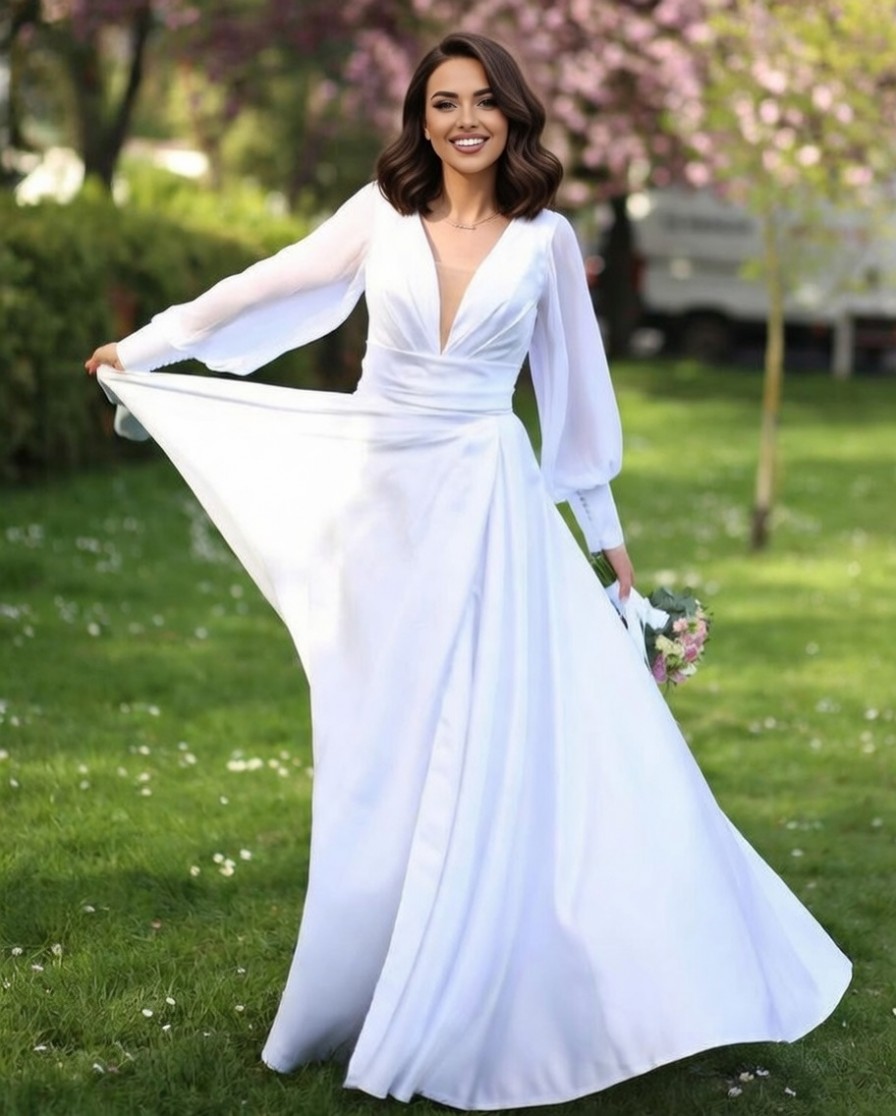 Цей універсальний шедевр з білого атласу ідеально підходить для будь-якої пори року — весни чи зими — і підходить для будь-якої нагоди, від повсякденних цивільних церемоній до елегантних вечорів. Завдяки вшитим чашечкам без кісточок, що забезпечують підтримку, ви випромінюватимете впевненість та грацію всю ніч!