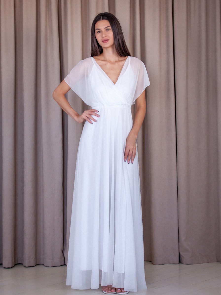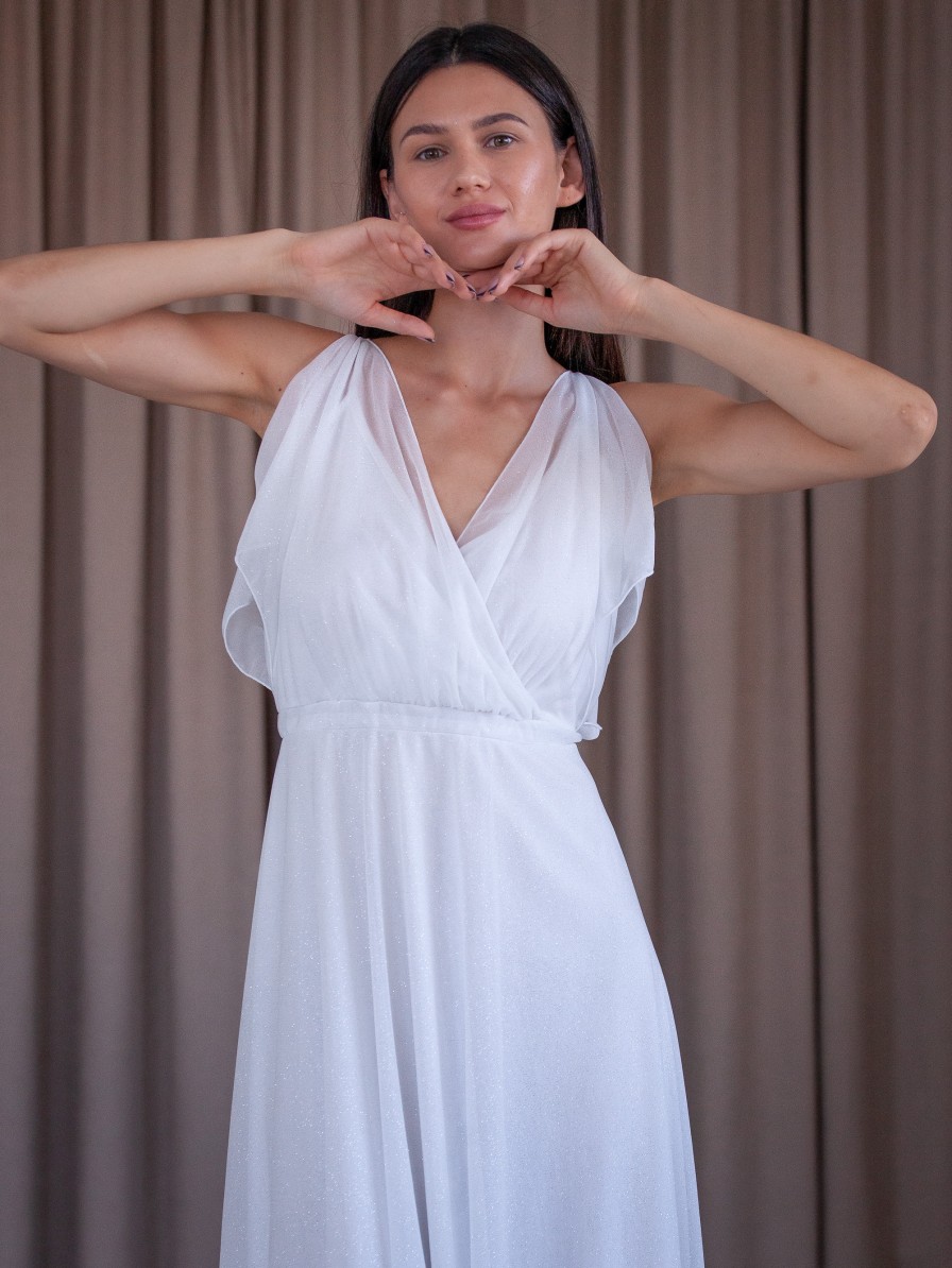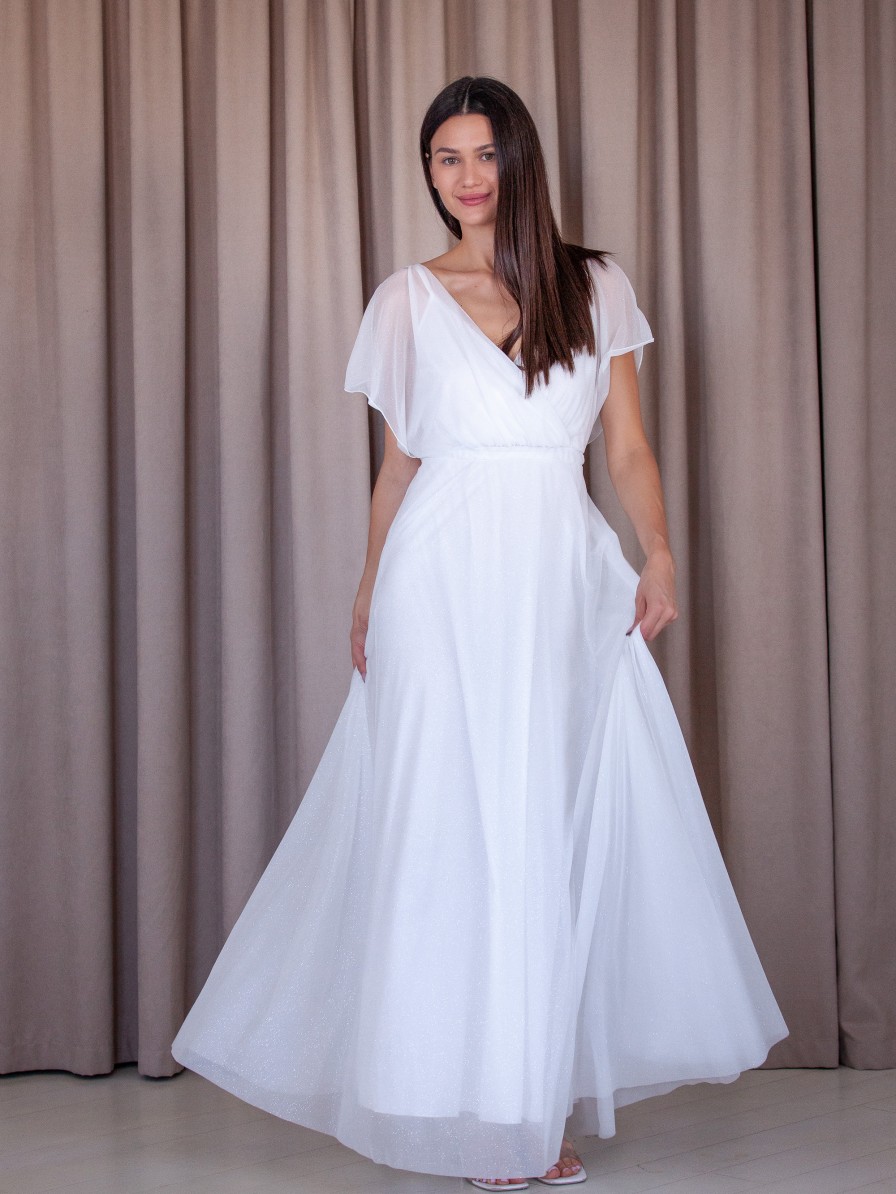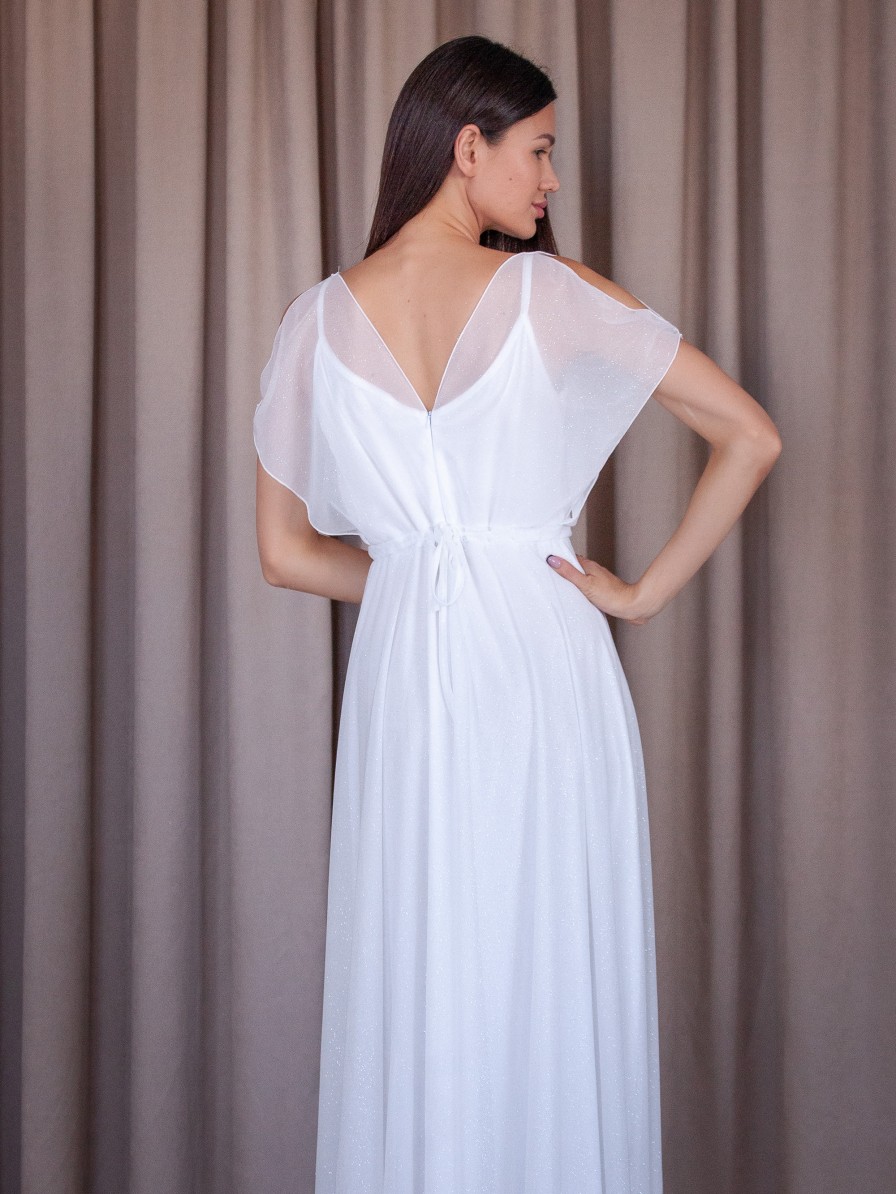 Ваши поиски идеального летнего свадебного платья заканчиваются! Этот потрясающий макси в пол изготовлен из матового шифона, который едва заметно блестит на солнце. Его элегантный однотонный узор делает его идеальным выбором для простой церемонии или легким свадебным вариантом.