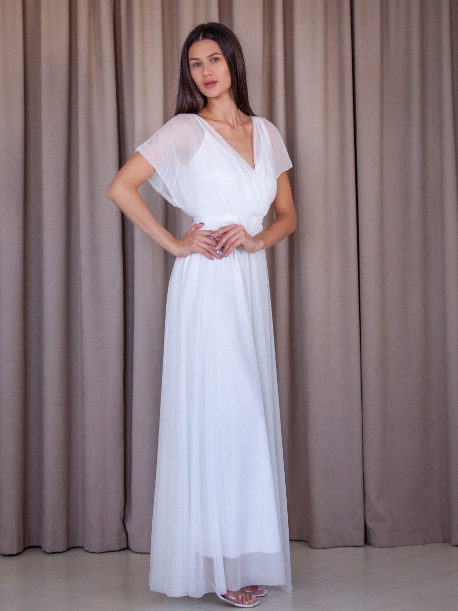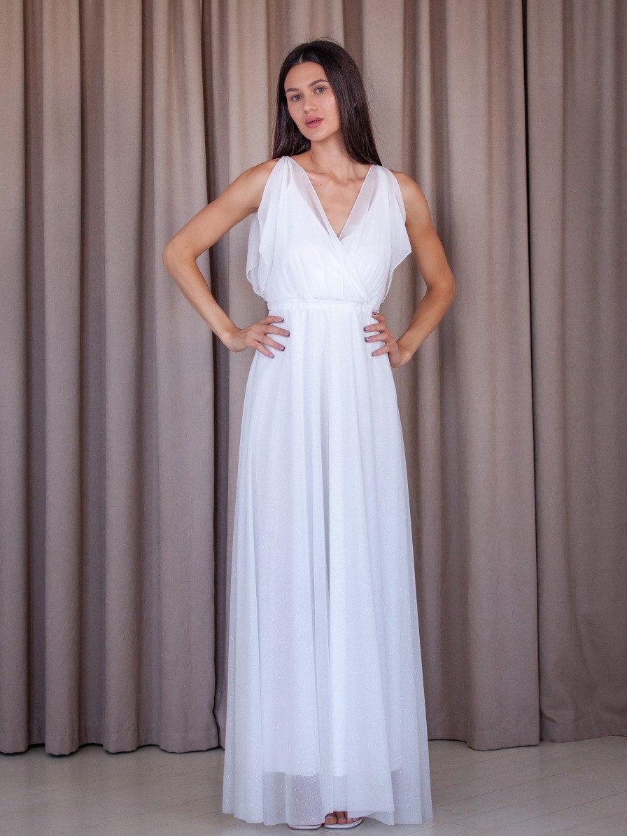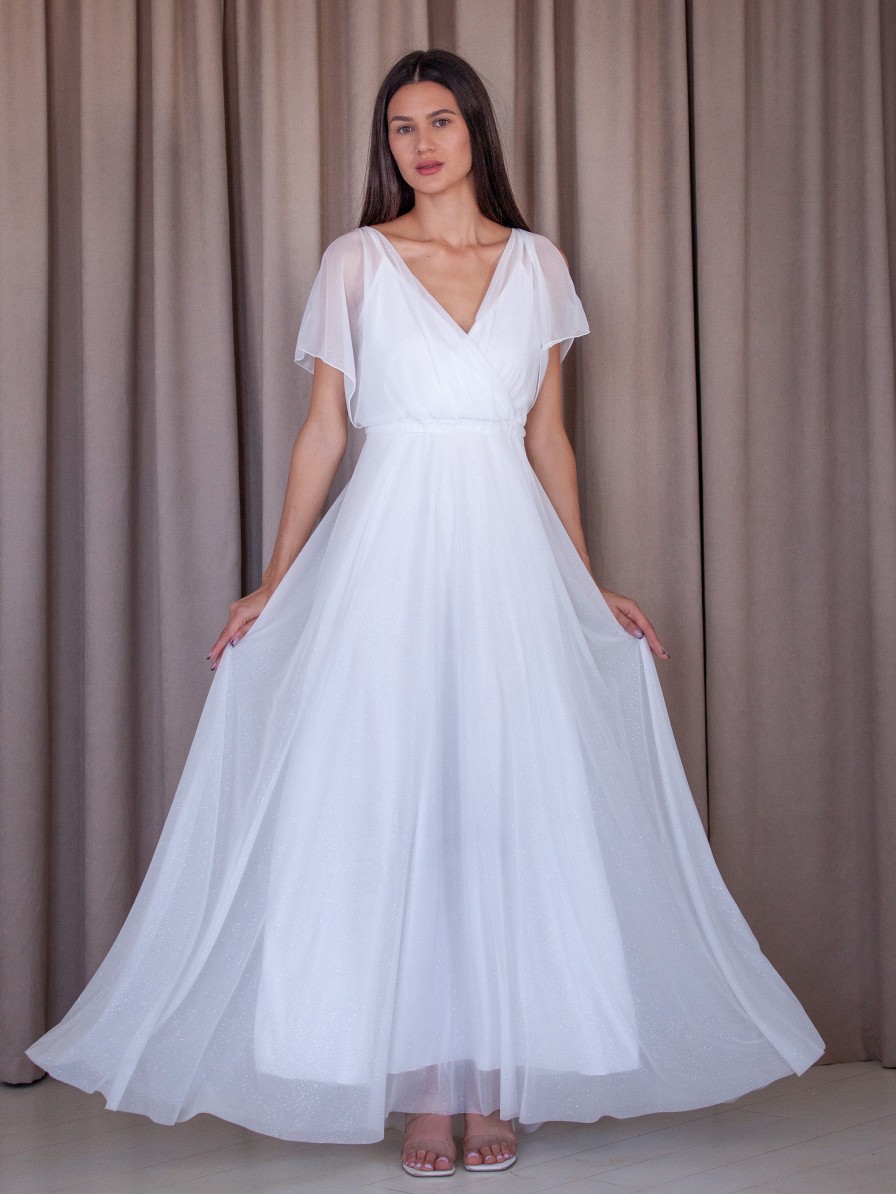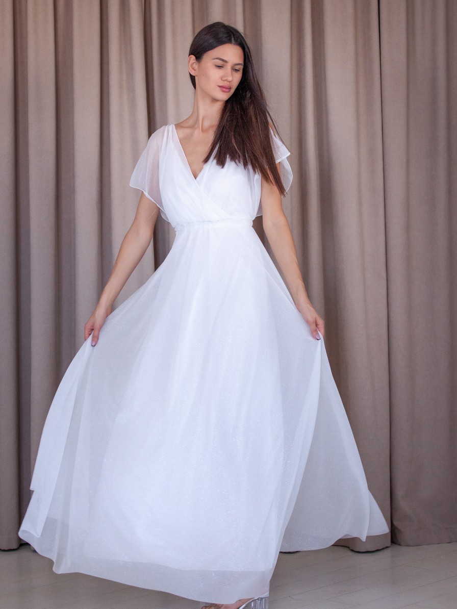 Ваши поиски идеального летнего свадебного платья заканчиваются! Этот потрясающий макси в пол изготовлен из матового шифона, который едва заметно блестит на солнце. Его элегантный однотонный узор делает его идеальным выбором для простой церемонии или легким свадебным вариантом.