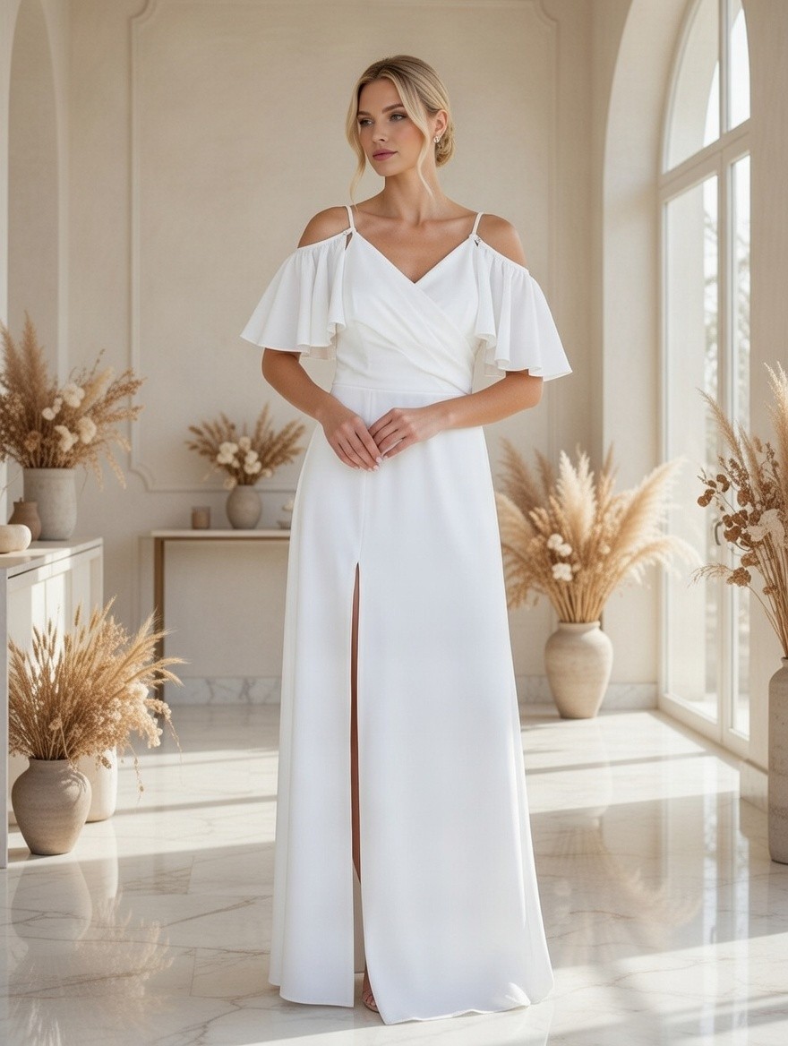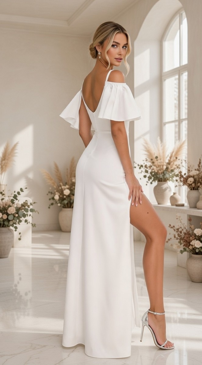 Это белое платье – воплощение простой элегантности и комфорта. Лёгкая ткань красиво струится, когда вы двигаетесь, а верх-обертка придаёт ему мягкую, женственную форму. Разрез добавляет нужное количество очарования, не делая его слишком вычурным.