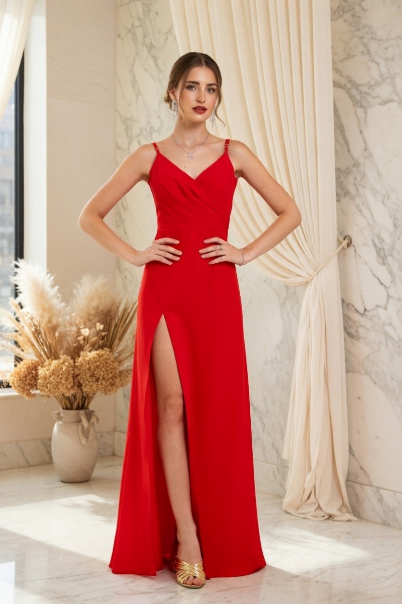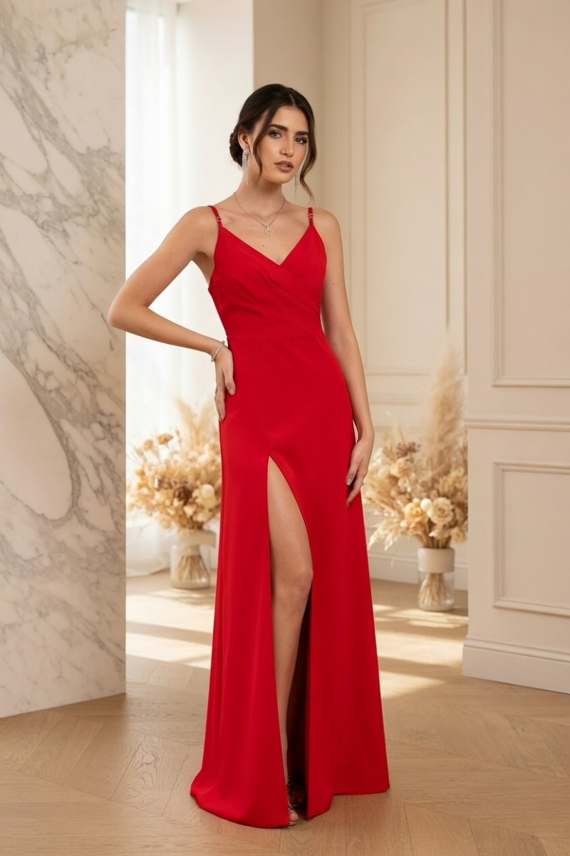 Элегантное красное макси-платье с соблазнительным разрезом на ножке сделает вас звездой вечера, приковывая восхищенные взгляды гостей мероприятия. Приталенное платье со свободной летящей юбкой подчеркнет вашу женственность и убедит каждого в вашем изысканном вкусе.