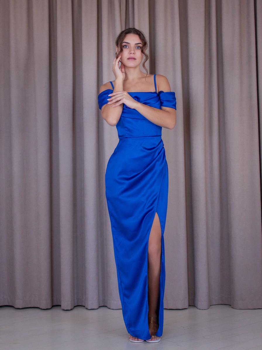 Ощутите элегантность в этом потрясающем атласном макси-платье синего цвета, которое идеально подойдет для любой гостьи на весенней или летней свадьбе. Силуэт «труба» длиной до щиколотки изящно облегает ваши изгибы, а асимметричный драпированный крой и естественная линия талии обеспечивают идеальную посадку. Вам понравится изысканный вырез «лодочка» в сочетании с шикарными спущенными плечами и короткими рукавами.
