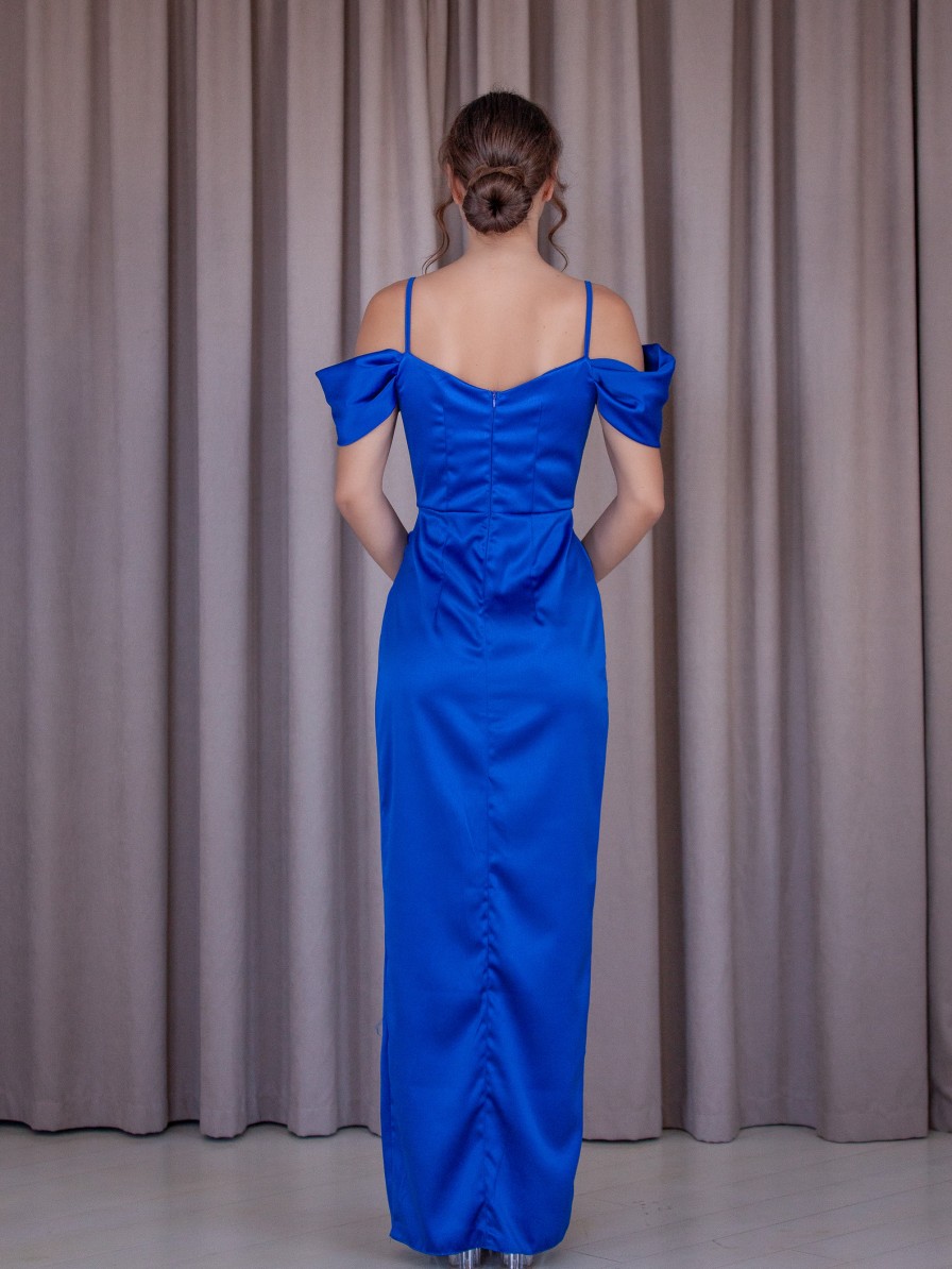 Синее облегающее платье рыбка с вырезом на ноге и приспущенным рукавом
